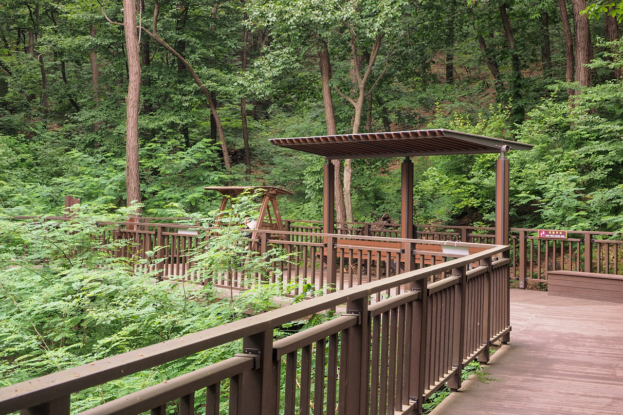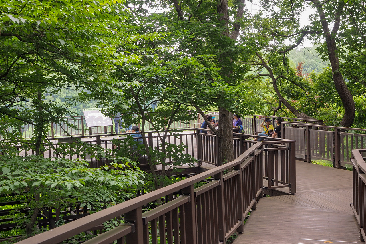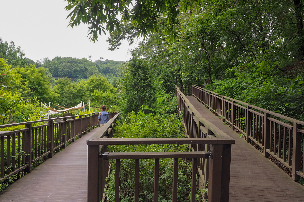 약 2km 정도의 데크길을 걷고 만나는 무릉도원 수목원이 한눈에 내려다보이는 전망대는 아이들과 어르신들이 모두 좋아할 듯 한데요. 데크길 중간에 위치한 숲울림터와 곤충 호텔은 또 다른 재미를 더했습니다.