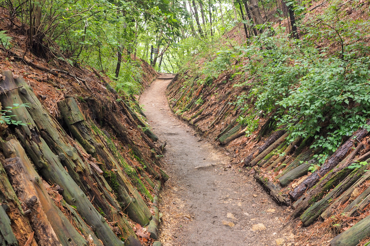 나무 각목을 벽으로 만든 인상적인 길이다.