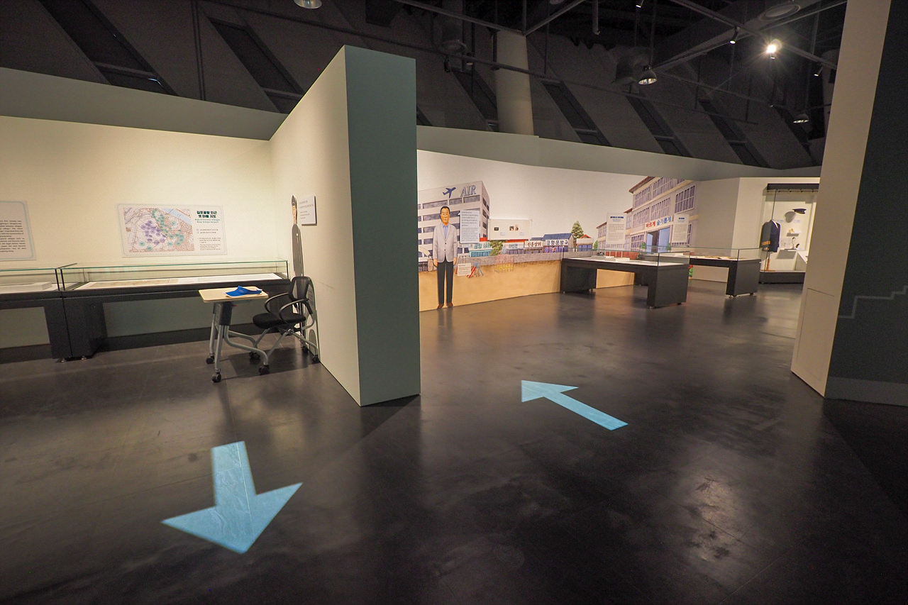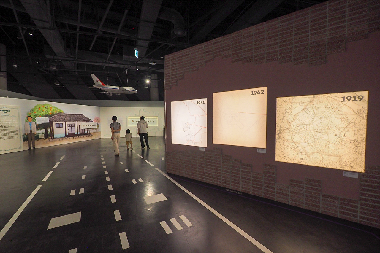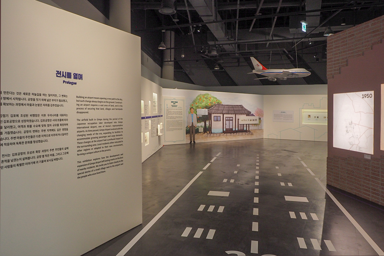 전시는 △김포공항 설립 초기 역사 △공항 확장과 마을 이주 △주민 인터뷰 영상 △공항동 주민의 비행 꿈 △공항시장 상인 이야기 총 5부로 구성되어 있다 . 먼저, 1부 ‘김포공항, 변화의 시간’에서는 1942년 경기도 김포 농촌 마을에 첫 비행장이 생기고, 이후 활주로 및 터미널 확장과 1963년 서울 편입까지의 역사를 지도와 사진으로 보여준다.