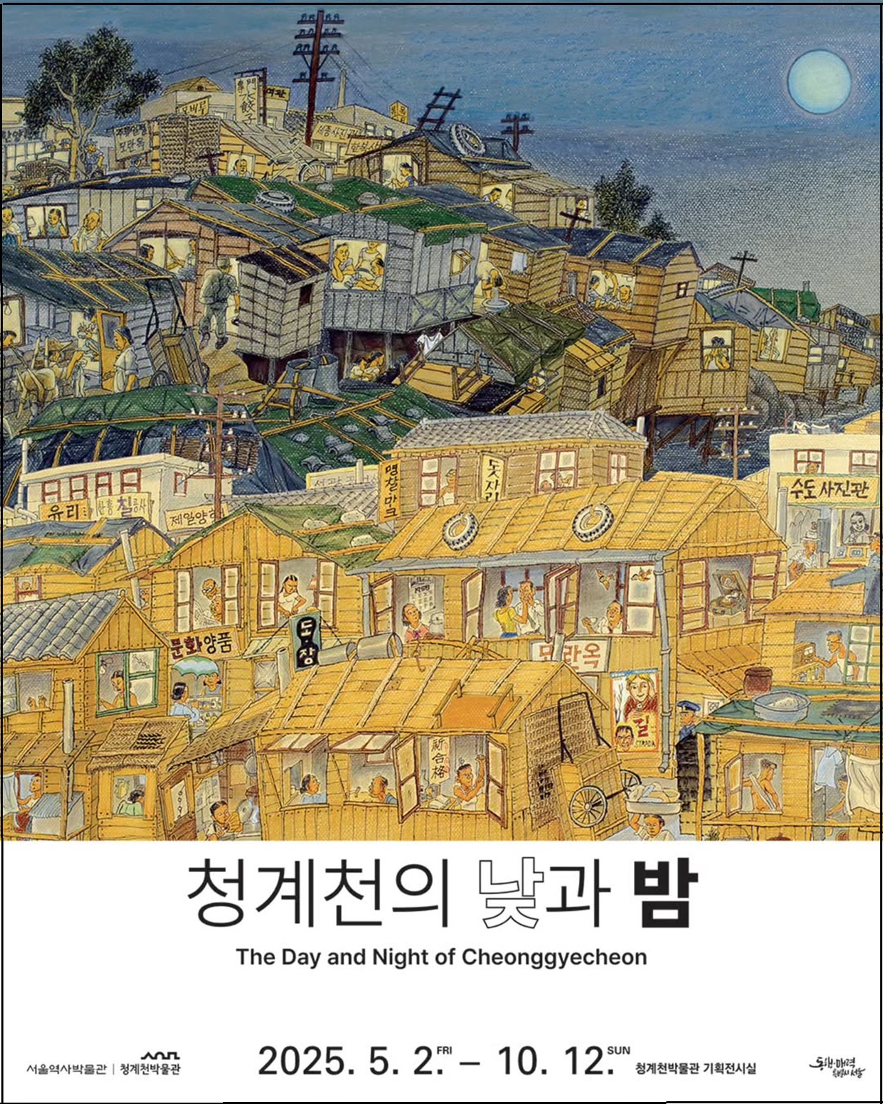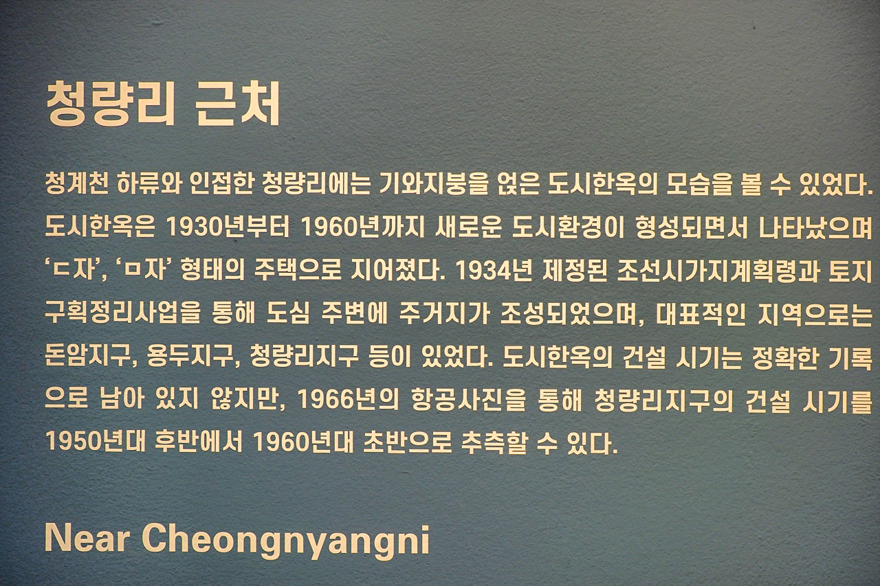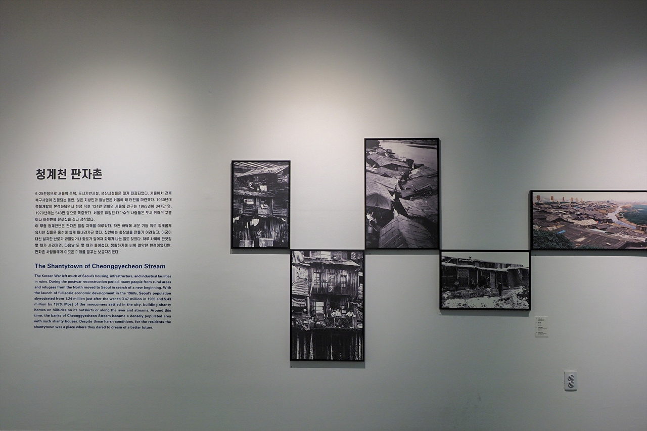 당시 청계천은 6·25전쟁 이후 지방민과 월남민이 몰려들며 대표적 판자촌 지역이다. 청계천변을 따라 길게 늘어선 판자촌, 옆과 위 아래로 다닥다닥 붙어있는 방 안에서 판자촌 사람들은 ‘잘 살고 싶다’는 미래를 꿈꾸었다. 공동수도와 공동변소를 사용했다. 불편하고 어려웠지만 서로 부대끼고 의지하며 일상을 이어 갔다. 이후 1960년대 도시화와 1970년대 재개발 흐름 속에서 외곽으로 밀려났고, 1958년 시작된 청계천 복개 공사는 1977년 완공되었다. 청계천은 도시 정비의 대상이자 서민 삶의 터전이었으며, 압축 성장기의 시행착오가 남은 공간이다.