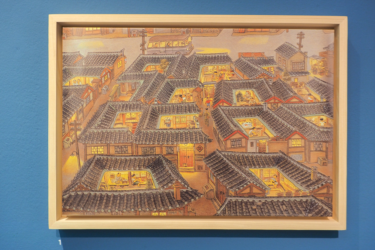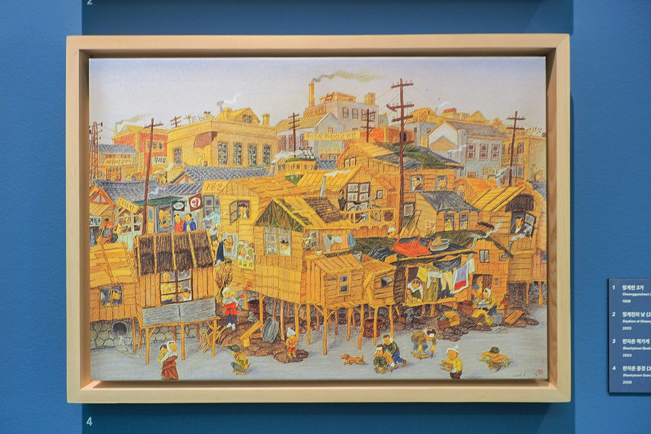 김성환 화백은 당시 판자촌과 그 안의 생활상을 풍속화로 남겼다. 사진의 차가운 기록과 달리, 그의 그림은 따뜻한 색감과 서정적인 분위기, 해학적인 표현으로 현실을 담아냈다. 판잣집 구석구석에는 빠듯한 일상과 삶의 그늘까지 세밀하게 표현돼 있다.