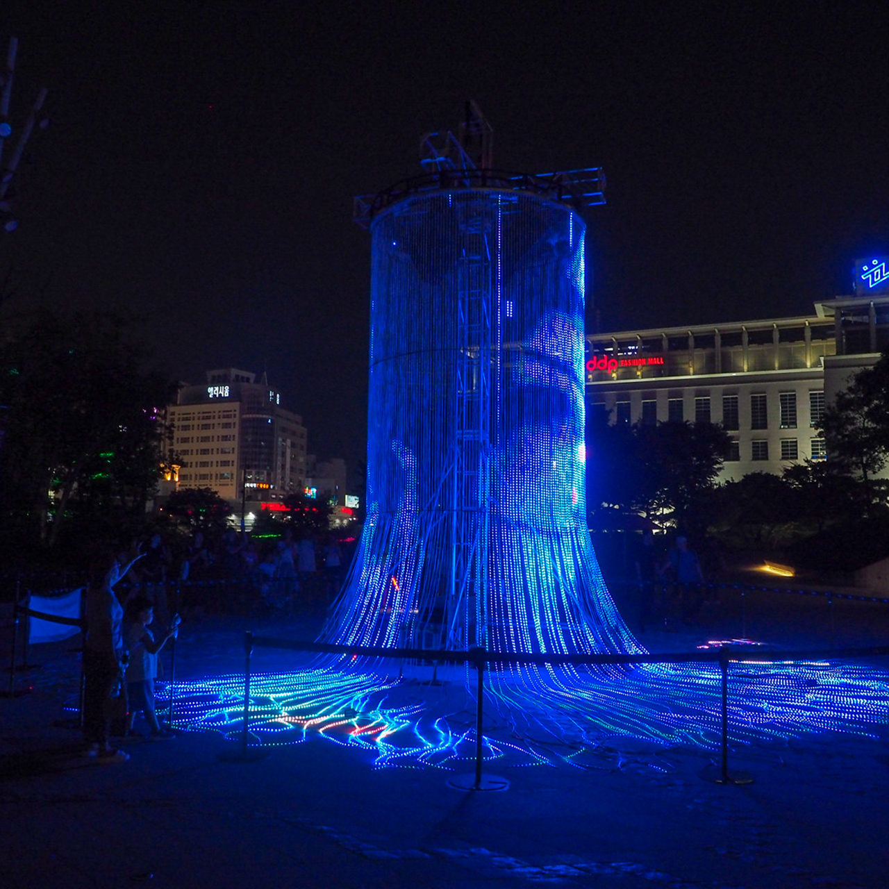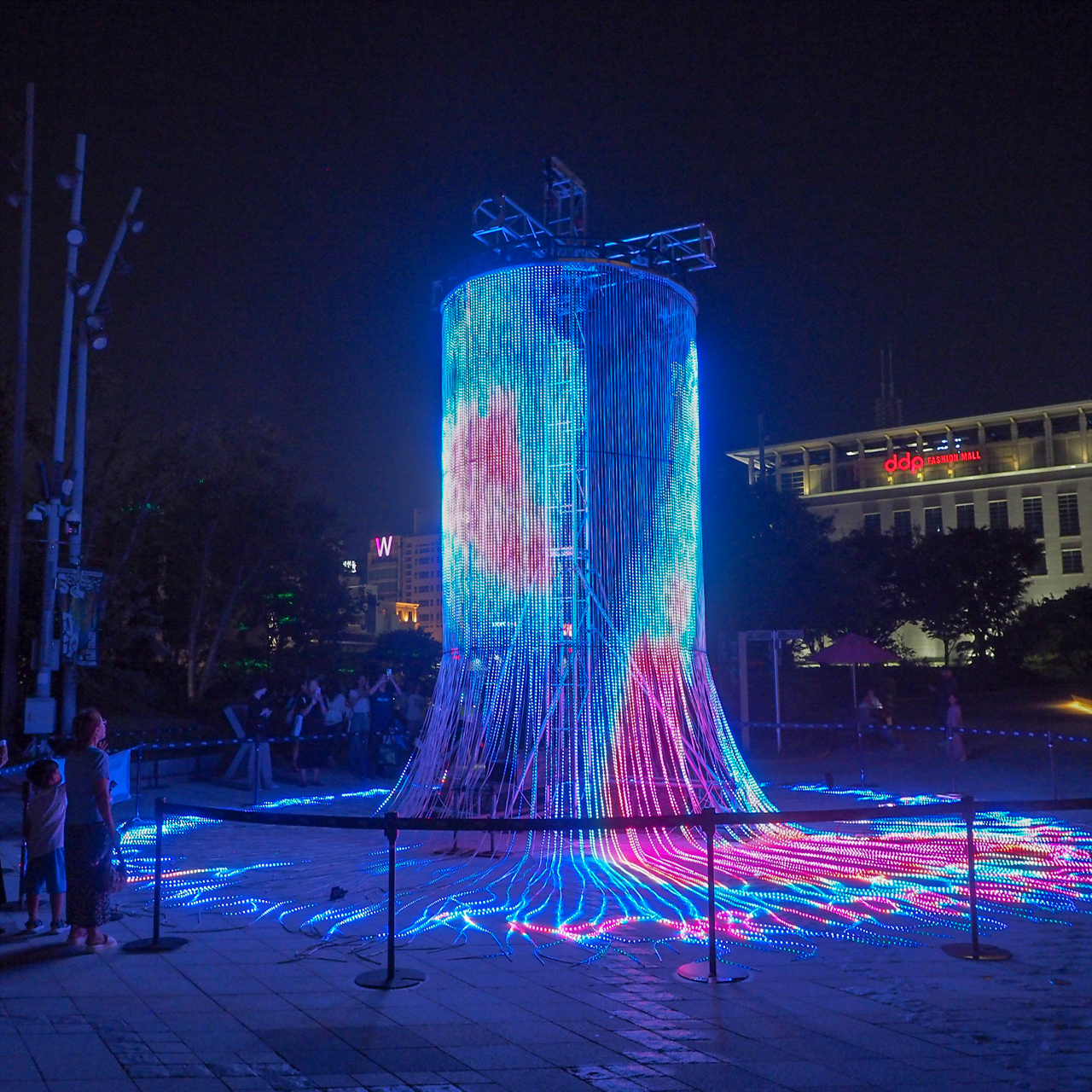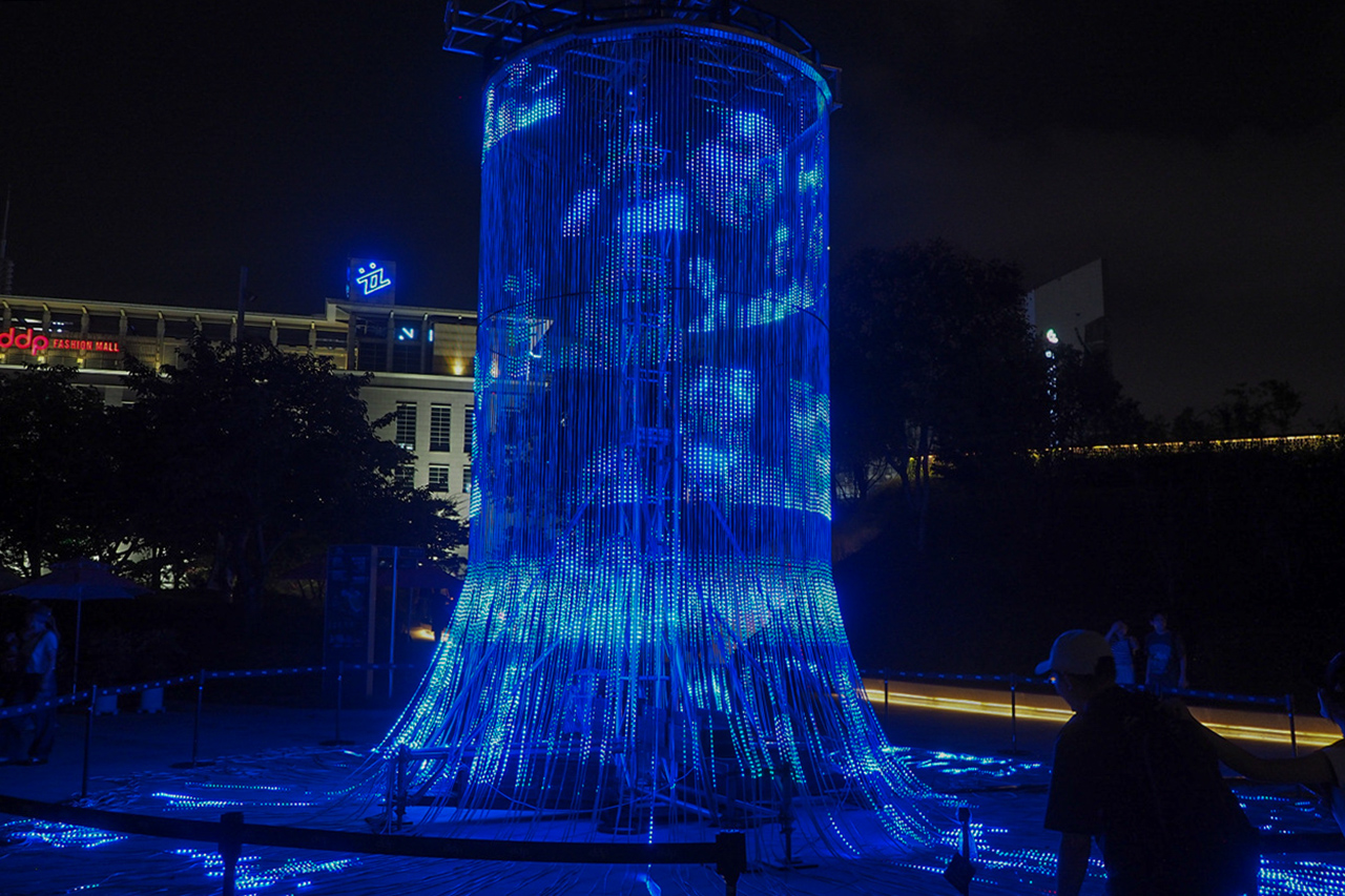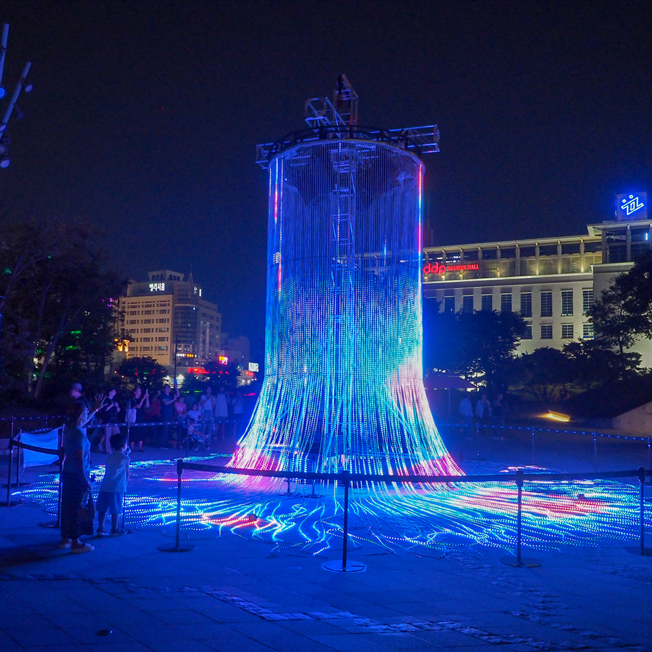 DDP ‘미래로’ 벽면에 투사된 ‘Into the Waves of Light’는 미래로 펼쳐지는 빛의 흐름과 감각의 물결을 시각화하여 관객들을 일상과 예술이 어우러지는 미디어아트의 세계로 깊숙이 이끌었다. 바닥분수, 안개분사 캐스케이딩 등 다양한 수경 요소와 어우러진 빛의 향연은 그야말로 황홀경이었다.