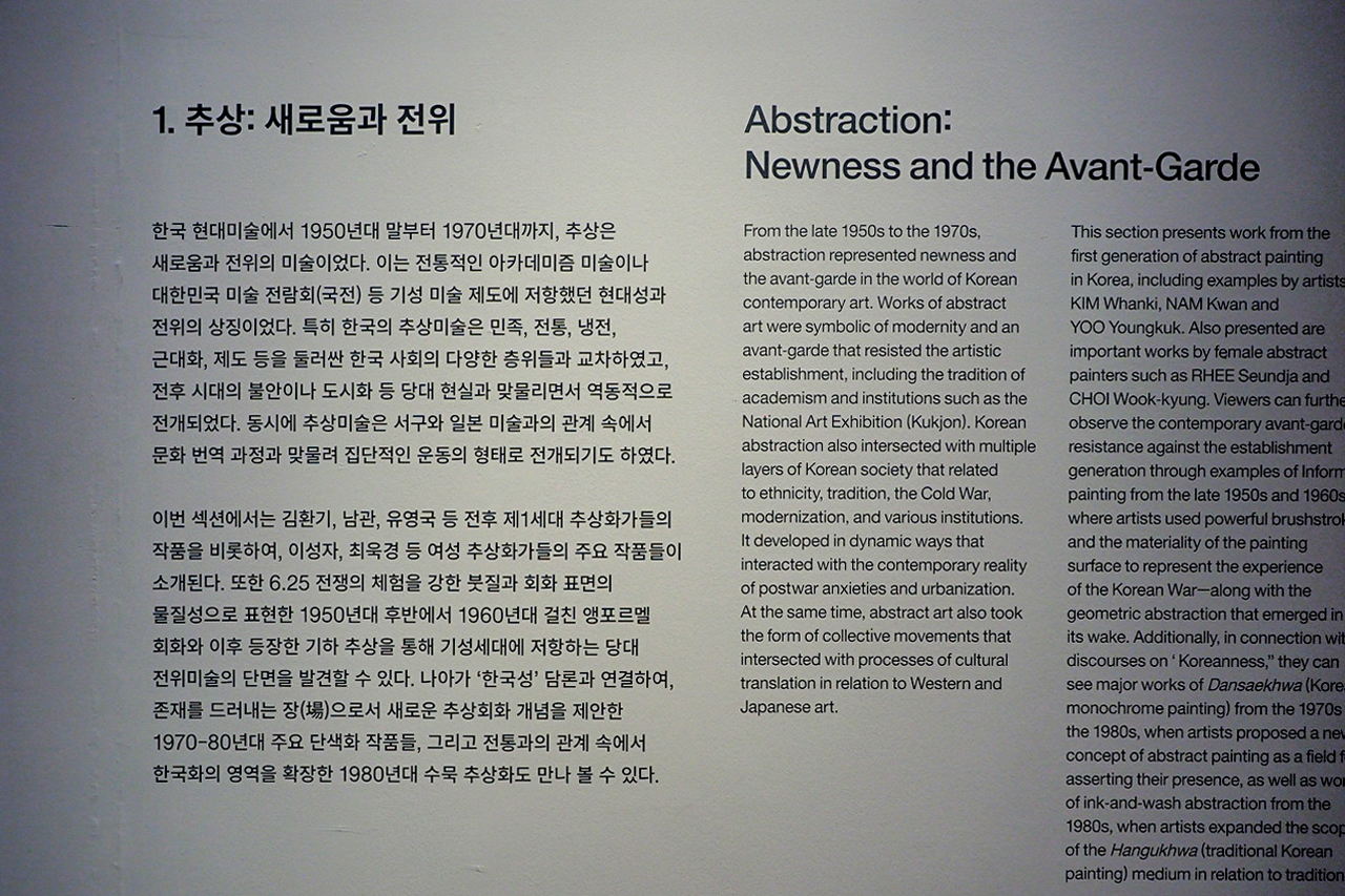 ※ 김환기 ‹산울림 19-II-73#307›(1973), 박생광 ‹무속 3›(1980)는 «이건희컬렉션 국외 순회전»(미국 국립아시아예술박물관, 미국 시카고박물관, 영국 영국박물관) 출품으로 2025년 9월 7일후에는 김환기 ‹여름 달밤›(1961), 박생광의 ‹무속 16›(1985) 로 교체될 예정입니다. - 안내문
