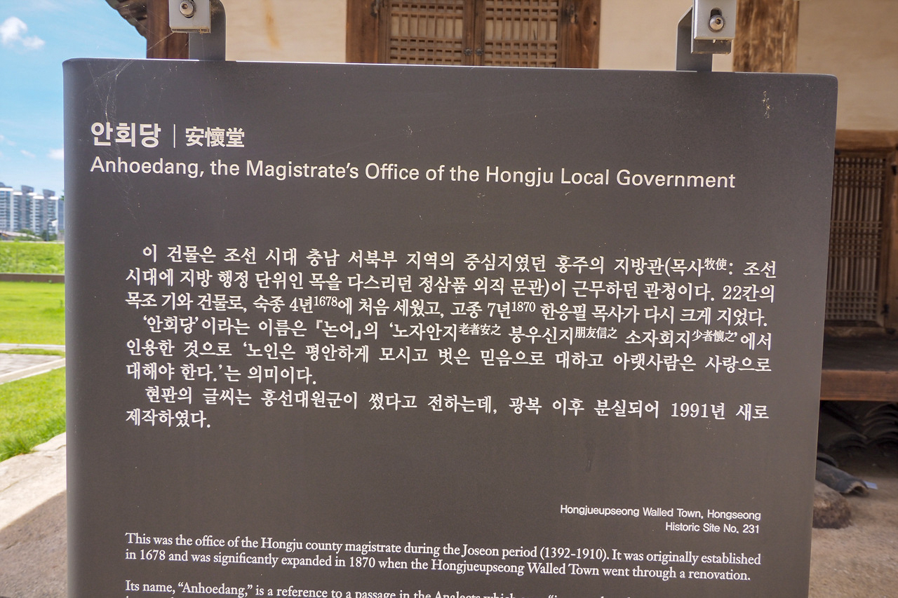사적 제213호인 안회당(安懷堂)은 조선시대 홍주목사가 집무를 보던 동헌(東軒)이다. 동헌은 지방관아의 핵심 건물로 객사(客舍),향교(鄕校)와 함께 중요한 의의를 갖는 곳이다. ‘안회’는 논어의 공야장편에 나오는 ‘老子安之 明友信之 小者懷之 : 노인을 평안히 모시고 벗을 믿음으로 사귀고 어린사람을 사랑하여야 한다’ 에서 따온 말이다.