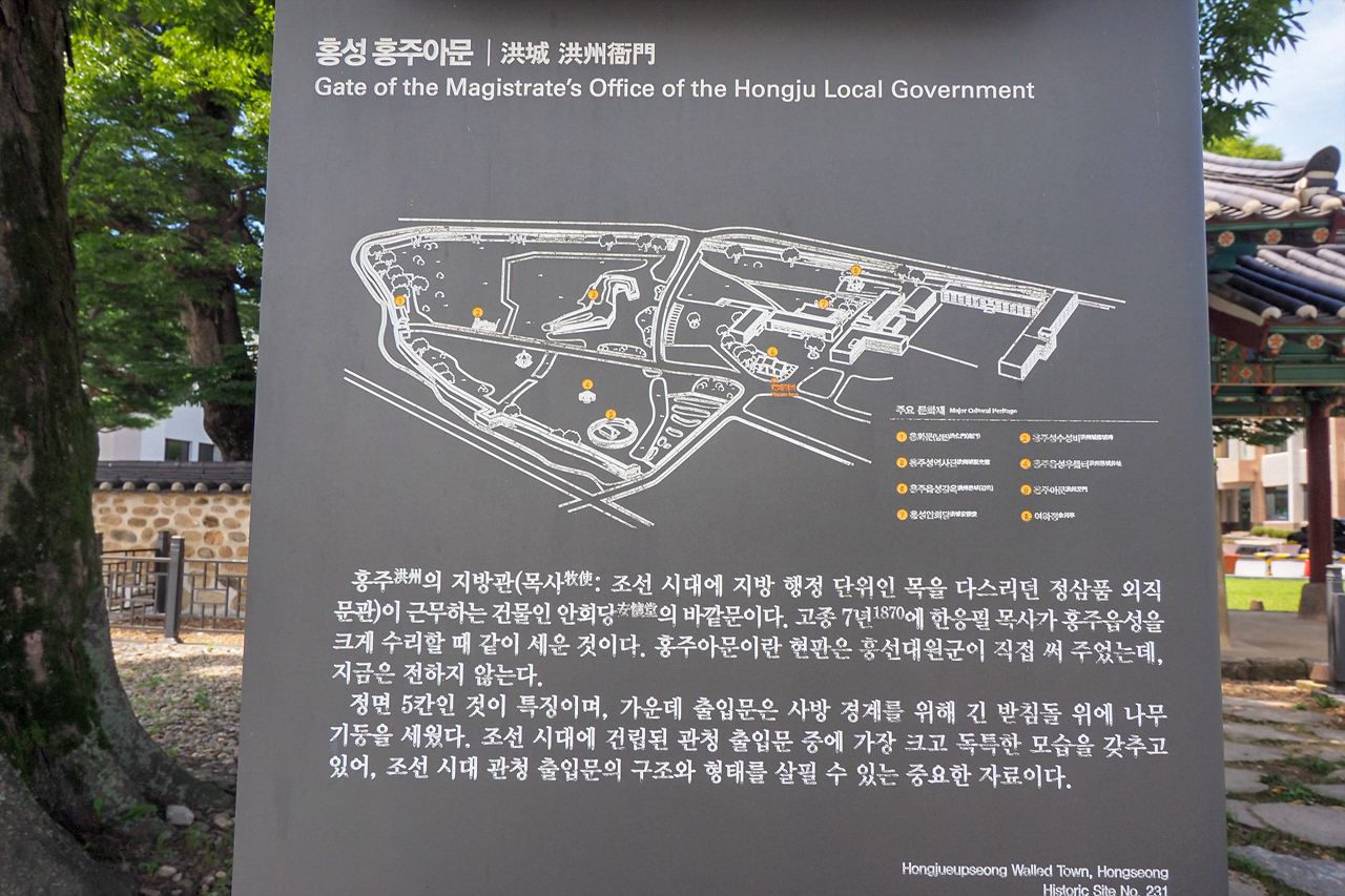 사적 제231호인 홍성 홍주읍성 내 조선시대 홍주목 동헌인 안회당 외삼문인 ‘홍주아문’이다. 1870년 홍주목사 한응필이 홍주읍성을 대대적으로 보수하고, 동문 조양문의 문루를 설치할 때 함께 세운 것이다. 현재 건물에 걸려있는 ‘홍주아문(洪州衙門)’ 현판은 흥선대원군 이하응이 친필로 사액한 것이며, 홍주아문은 우리나라 아문 가운데 가장 크고 특이한 형태를 지니고 있다.