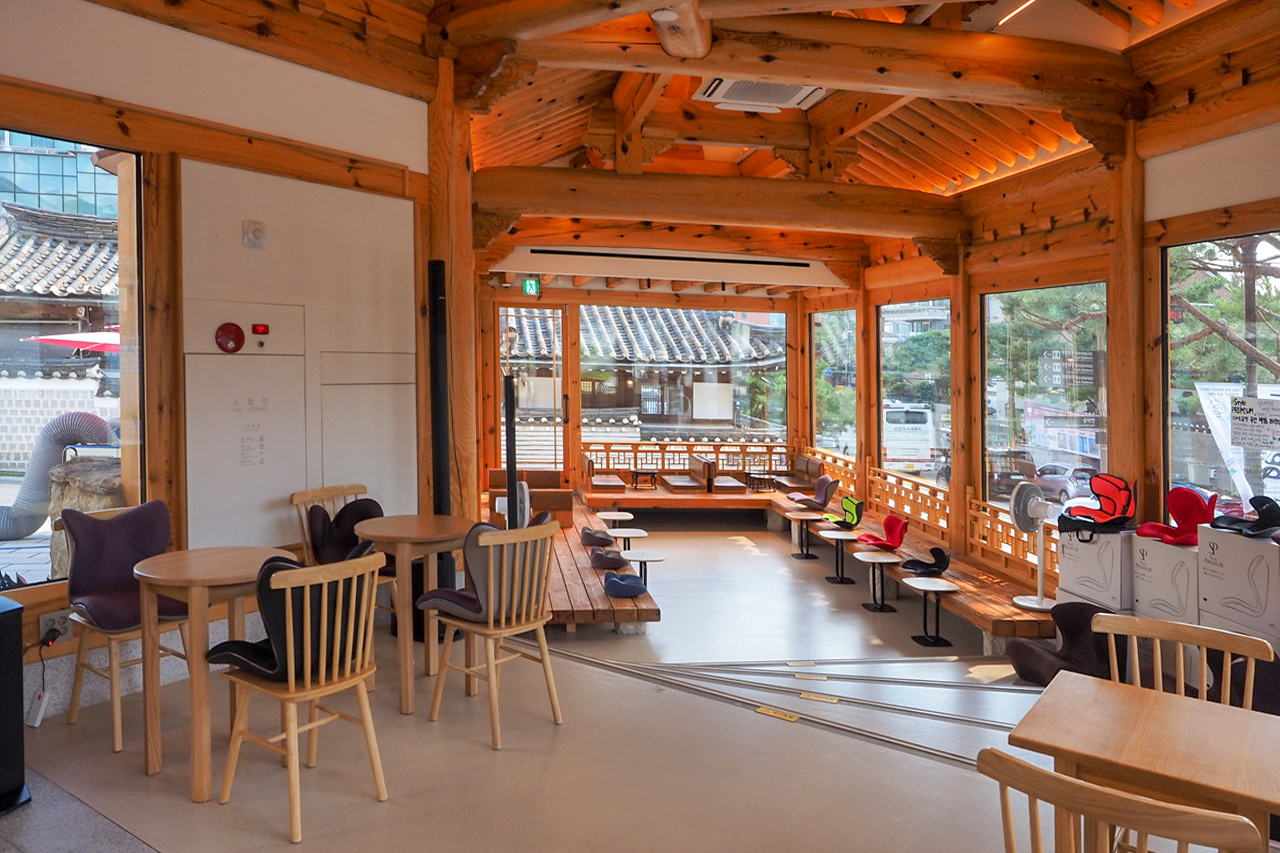 북촌 대로변에 위치한 거대한 한옥. 커다란 창문으로 들어오는 따뜻한 햇살과 고즈넉하고 깔끔한 인테리어가 돋보이는 이곳의 이름은 ’지음당(知音堂)’으로, 한옥에서는 쉽게 볼수없는 S자 구조로 되어있어 더욱 특별한 느낌을 주는데요. 여러명이 함께 앉을수 있는 테이블석은 물론, 한옥마을의 전경을 바라보며 티타임을 가지기 딱 알맞은 좌식 공간도 마련되어 있어요.