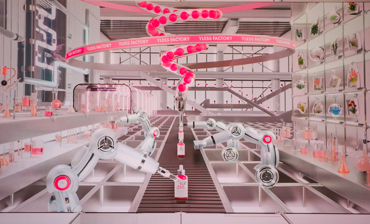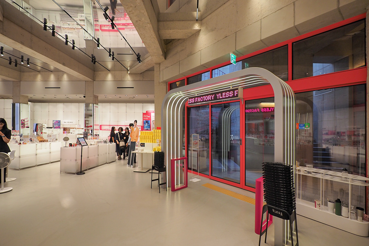 이 한옥 카페의 숨겨진 비밀 공간은 바로 뒷문에 위치한 엘리베이터와 계단으로 이어집니다. 길을 따라 지하 1층으로 내려가보면 전혀 다른 광경을 마주할 수 있는데요. 영화 속의 거대한 실험실을 연상케하는 세련된 공간 속에서 수많은 뷰티 제품들과 만날수 있는 이곳은 바로 ‘글로벌 K-뷰티 플랫폼 YLESS(와이레스)’의 플래그십 스토어입니다.