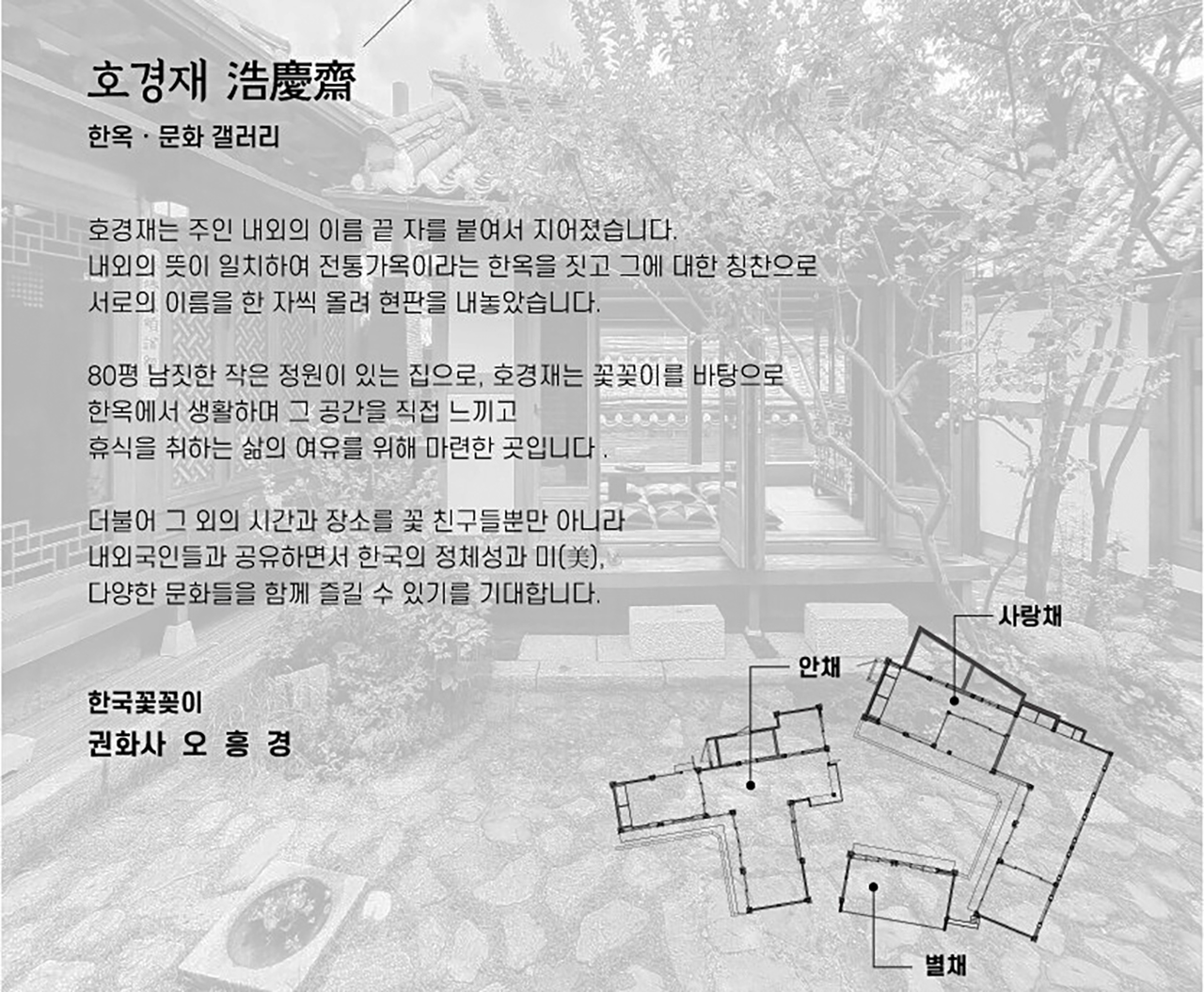 한국 꽃꽂이의 맥을 잇는 활동을 해오고 있는 권화사(勸花使)인 오흥경 대표가 80평(264㎡) 규모의 한옥에 꾸민 호경재는 우리 전통 가옥에 머물며 꽃꽂이 문화를 배우고 삶의 여유와 휴식을 체험할 수 있도록 만들어졌다.