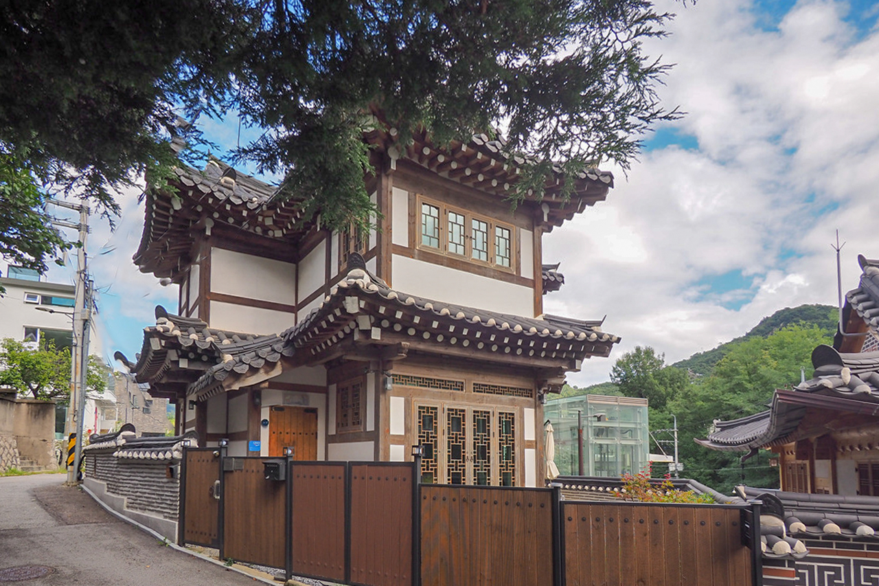 부암동 무계원옆에 우뚝솟은 2층한옥이 보인다.