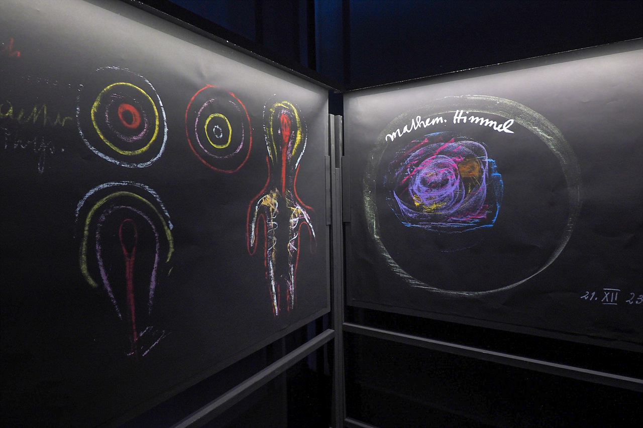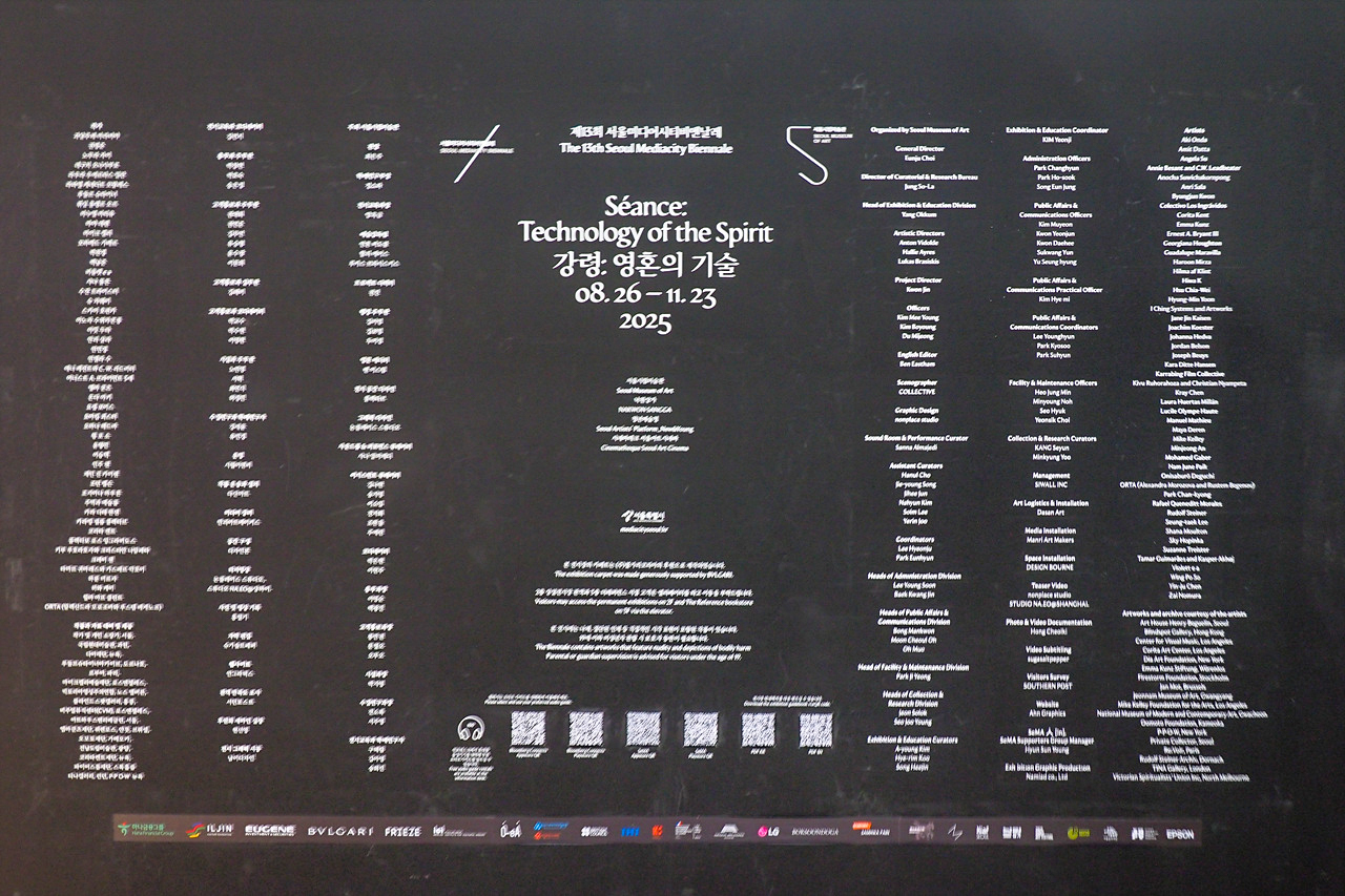 근현대의 굴곡진 역사가 담긴 SeMA의 마당과 카페 공간은 전시의 시작점으로 예술감독팀은 이곳을 ‘부활카페’라고 새로이 명명했다. 특히 비엔날레 개막식 당일, SeMA 마당에서는 작가 이승택의 ‘분신행위예술전’(1989/2025)이 펼쳐졌다. 대지미술과 한국 무속 전통을 결합하는 이승택은 마당에 조각상을 배치하고, 불사르는 퍼포먼스를 보여준다. 예술을 물질로부터 분리해 영적 해방을 이루는 이 작품은 물질을 불사르는 행위, 즉 소멸의 행위로부터 새로운 예술을 탄생시키는 작업이다. 타오르는 불티와 함께 탄생한 새로운 예술은 ‘부활카페’라는 이름과 조화를 이룬다. 전시는 ‘어제 온다면, 내일은 최초가 되리라’클러스터로 이어진다. 사회 개혁가이자 건축가였던 루돌프 슈타이너, 조지아나 하우튼, 힐마 아프 클린트, 데구치 오니사부로, 엠마 쿤츠, 백남준 등 오늘날 우리가 살아가는 패러다임을 창조한 작가나 인물들의 작품이 전시장의 도입부에 펼쳐진다. 예술감독팀은 이미 고인이 된 작가들을 다룸으로써 전시를 역사적 부분에서부터 시작하고 싶었다고 설명한다. 강령회란 결국 물리적으로 부재한 이들과의 대화이기 때문이다. 고인이 된 작가들은 작품을 통해 관람객들과 연결되며, 관람객들을 삶과 죽음이 교차하는 중간지대로 안내한다. ‘마녀와 영매의 것’클러스터에서는 자연세계와 초자연세계와 연결된 마녀, 점성가, 예언가와 관련된 작품들을 다룬다. 마녀가문에서 자란 작가 요하나 헤드바는 18세기의 마법 주문서 『악마학과 마법 개요서』에 수록된 수채화를 재제작한 두 점의 직물 작품을 선보인다. 작가 마야 데렌은 미완성 단편영화 ‘마녀의 요람’(1944)에 오컬트 의식을 펼치는 마녀를 등장시킨다. 거울을 통한 분열증적인 미장센과 인물을 포위하는 끈, 박동하는 심장 모형, 어지러운 쇼트들은 관람객들을 마녀의 몽환적인 세계로 인도한다. 수잔 트라이스터의 ‘헥센 5.0’(2023~2025)은 전통 강령회의 형식을 참고해 거대한 직사각형 테이블 위에 펼쳐진다. 타로 카드에서 모티브를 얻어 그린 수채화 78점은 타로 카드의 요소들을 현대 과학기술, 실천, 미래의 담론 등의 다양한 분야로 치환하며 과학, 예술, 영성이 서로 구분되지 않고 얽혀 있던 과거의 전통을 다시 이어나간다. 전시는 ‘트랜스’, ‘실천적 우주론’, ‘아픔을 치유하고, 망자를 일으키며, 환자를 씻기고, 귀신을 쫓아내라’, ‘테크네’, ‘등가 교환’ 클러스터를 지나며 트랜스·오컬트·원소적 얽힘·치유·기술 등 우리가 미신이라고 생각하는 영적 실천의 다양한 형태를 담아낸다. 그런가 하면 ‘적들이 승리한 세상에 망자의 안식은 없다’에서는 조상으로부터 받은 문화적, 정치적 유산이 영적 실천을 통해 현재에까지 이어져오고 있음을 보여준다. 다양한 문화권의 전통에서부터 우주론에 이르기까지 여러 관점에서의 영혼의 기술들이 각각의 클러스터에서 다뤄진다. 예술감독팀은 클러스터의 전환을 통해 관람객이 강렬함·고요함·대면 등 서로 다른 집중의 상태를 오가도록 이끈다. 관람객들은 공간별로 조율된 색의 파동에 주파수를 맞추며, 어제의 죽은 이들과 조우하고 또 다른 세계와 연결되는 체험을 하게 된다.