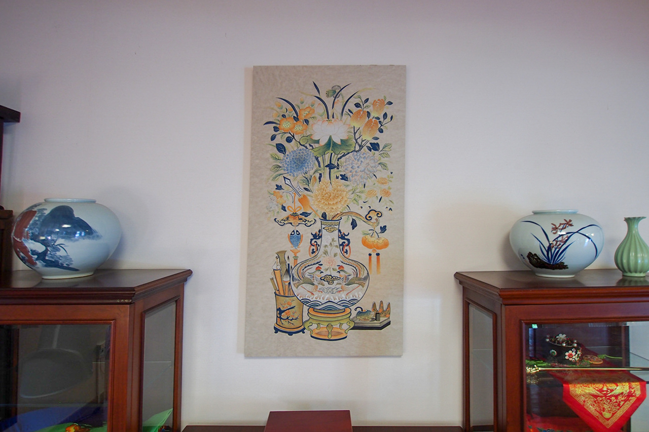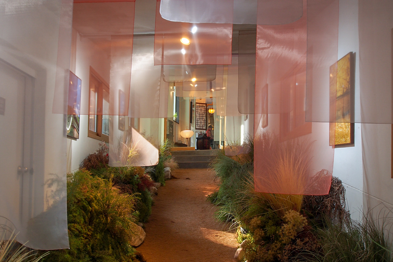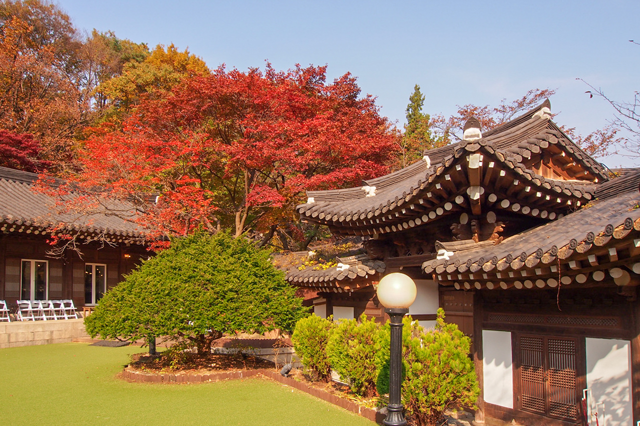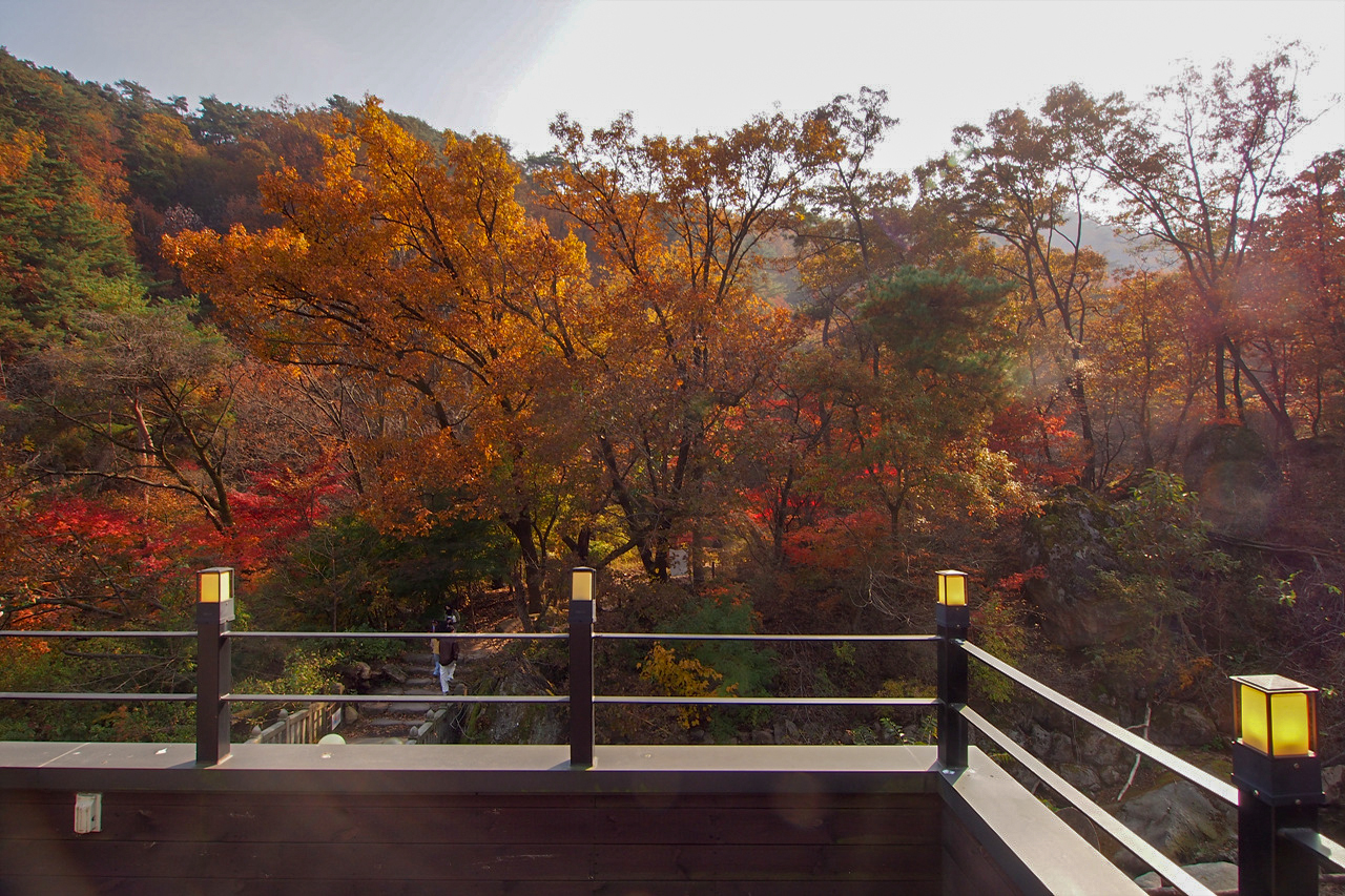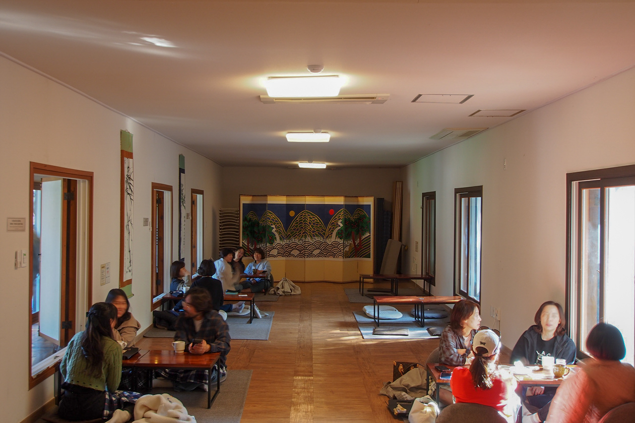 화려한 선운각의 사계절 사진을 감상하다 보면 한옥에 닿는다. 한옥은 너른 앞마당을 거느리고 있다. 마당은 야외 웨딩 장소로 사용한다. 마당에서 문을 통과하면 다리가 나온다. 한옥 두 채가 다리로 연결된 구조다. 다리는 포토 존으로 인기다. 한옥 내부로 들어서면 천장에 달린 커다란 등이 은은한 분위기를 풍긴다. 사람들이 차를 마시며 담소하는 모습이 평화롭다. 차를 가지고 마당에 나와 볕을 쬐며 겨울 정취를 즐긴다. - 안내문