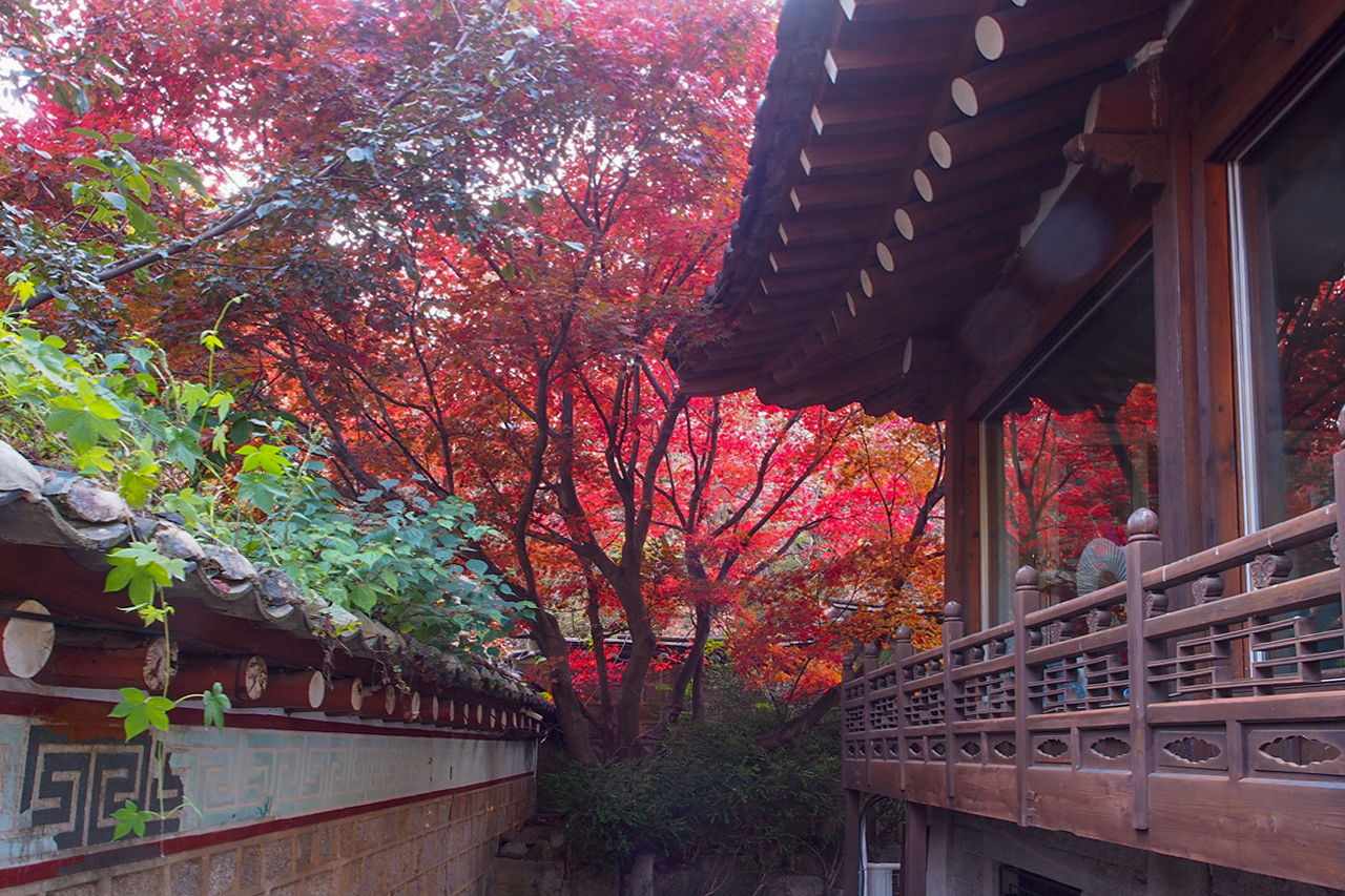 돌담 길을 돌면 선운각 출입구가 나온다. 내부에서 먼저 가볼 곳은 옥상이다. 봄가을에는 벚꽃과 단풍 촬영 명소지만, 겨울에는 다소 썰렁하다. 잎이 바짝 마른 단풍나무 뒤로 북한산이 보인다. 옥상에서 내려와 한옥으로 향한다. 음료를 주문하는 공간에서 한옥까지 복도로 이어진다. 복도에 선운각의 사진이 걸려 있어 마치 미술관에 온 듯하다.