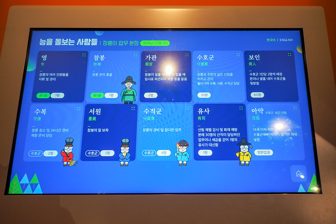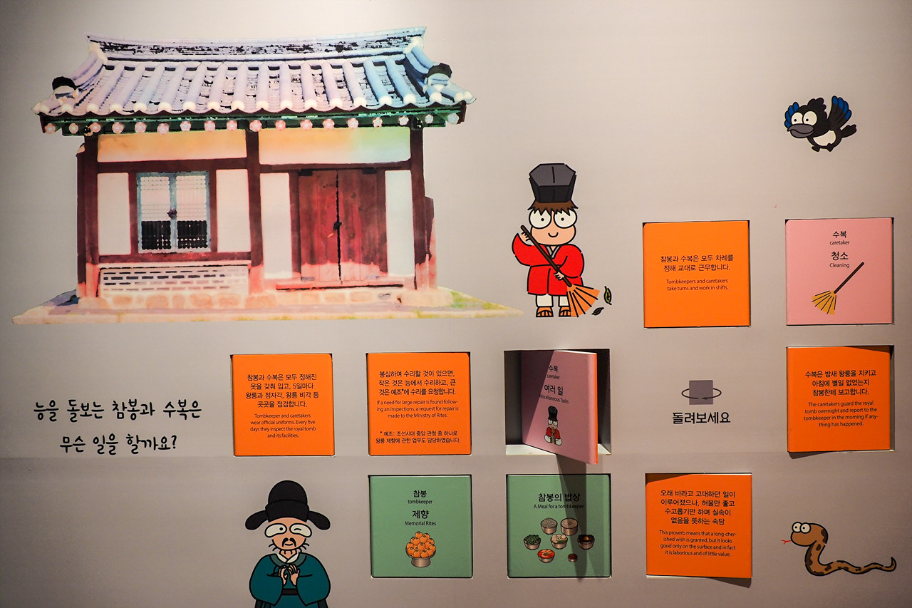새롭게 단장한 김포 장릉 역사문화관은 ▲김포 장릉 알아보기 ▲세계유산 조선왕릉 알아보기 ▲소통마당 세 부분으로 구성됐다. <김포 장릉 알아보기>에서는 김포와 장릉, 능주의 생애, 장릉의 변화와 공간 특성, 왕릉을 관리하던 사람들을 주제로 조성됐다. 「장릉지」 등 역사 자료를 바탕으로 궁능유적본부에서 직접 개발한 장릉 캐릭터 ‘참봉’과 ‘판노미’를 통해 더욱 친근하게 정보를 전달한다. 왕릉을 관리하던 관원과 군인이 어떻게 능을 보호하고, 각자 어떤 일을 했는지 자세히 알아볼 수 있다. - 안내문