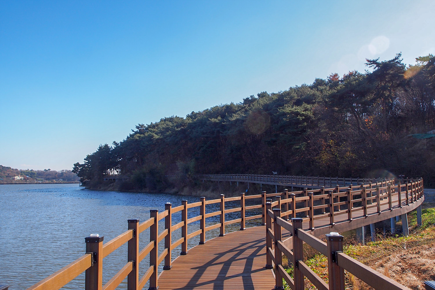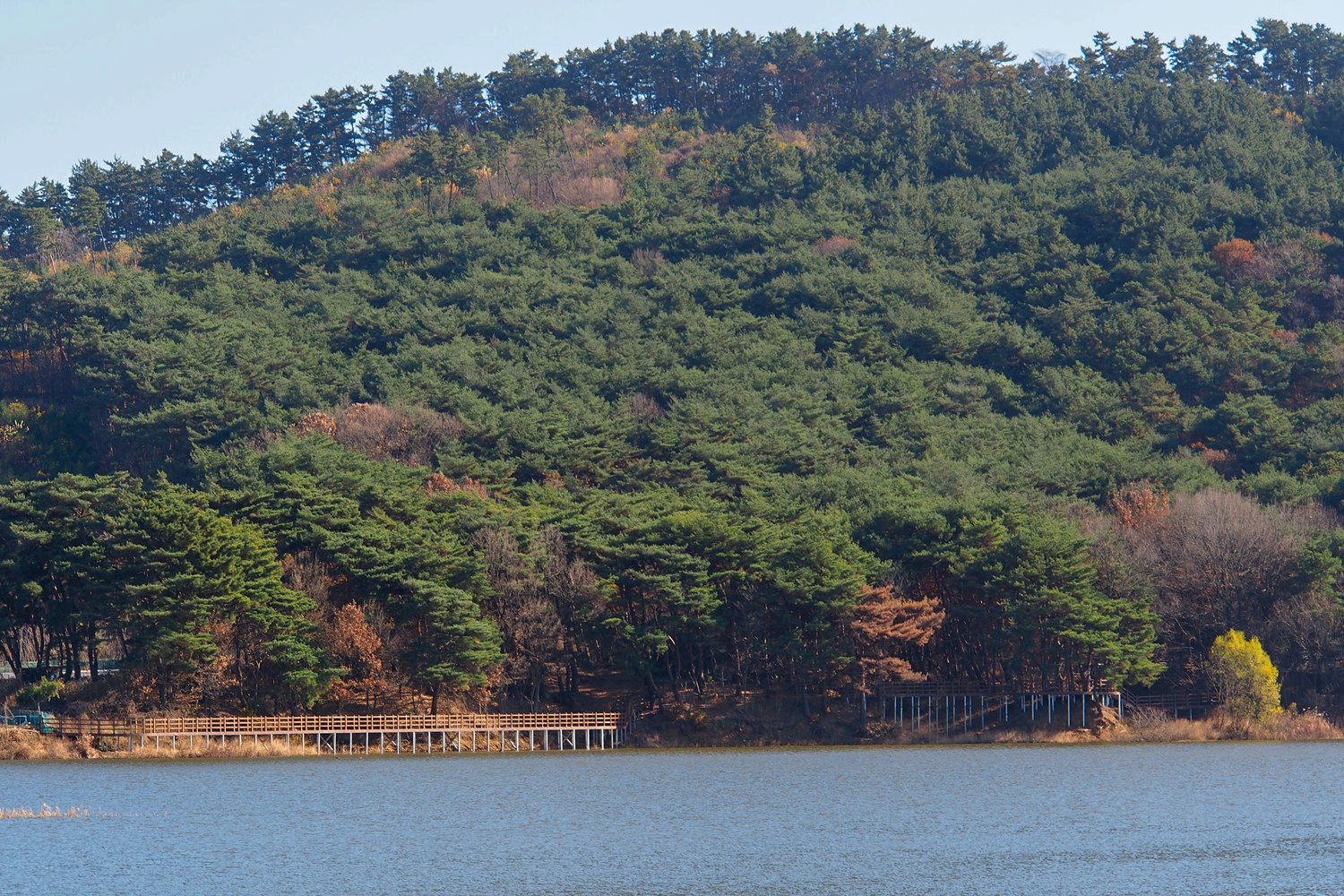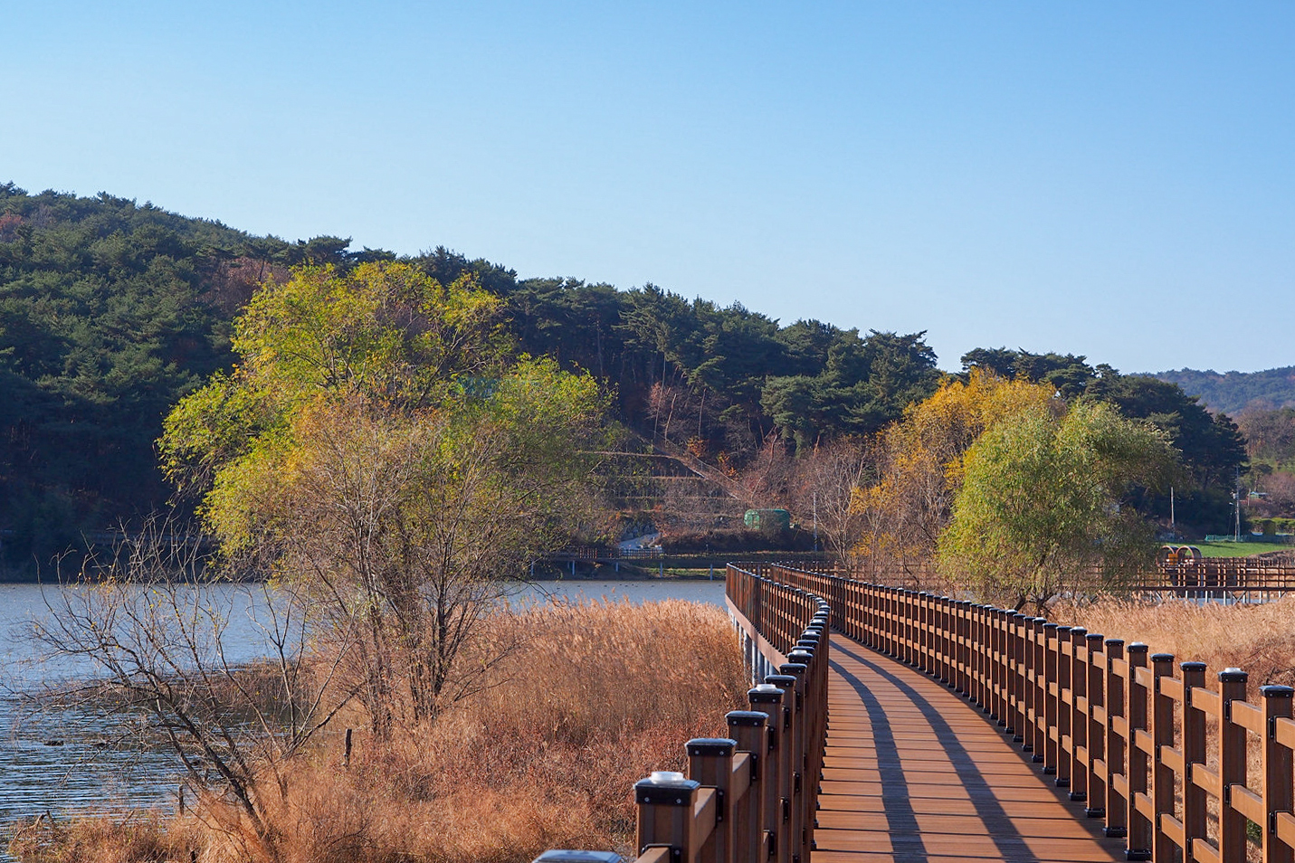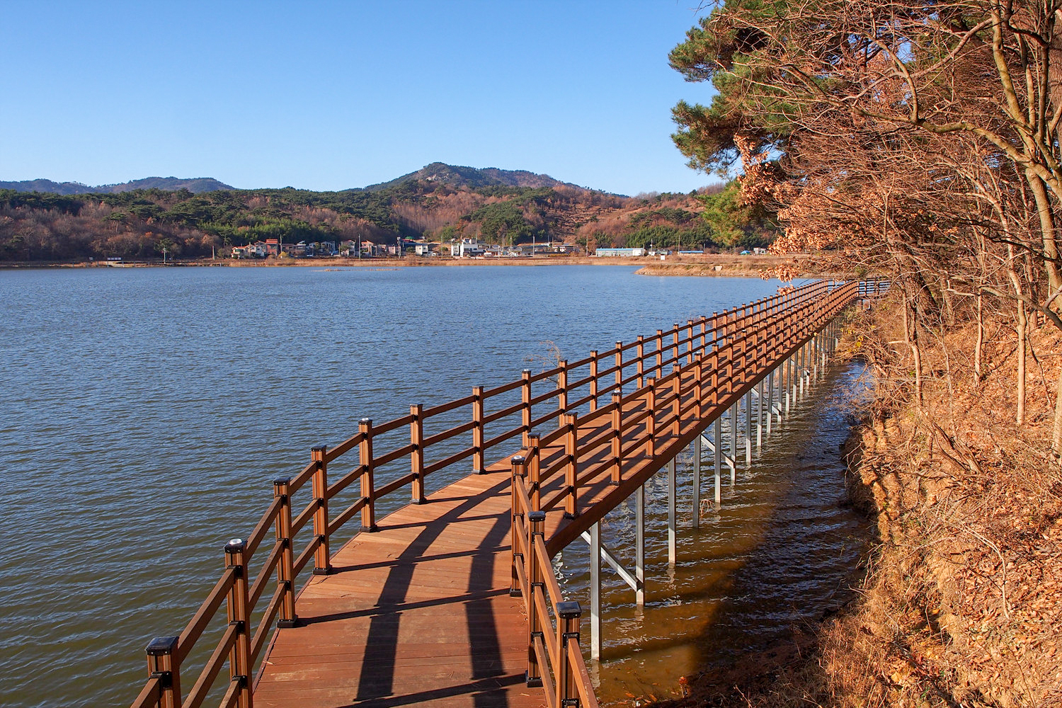 저수지 반대편에 보이는 데크길