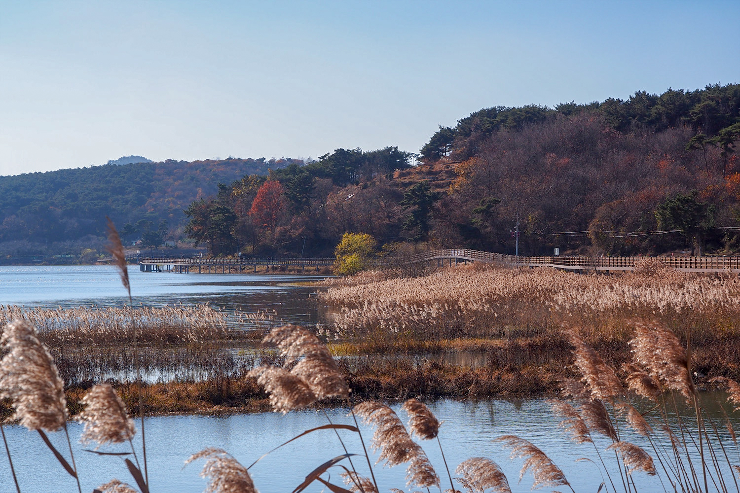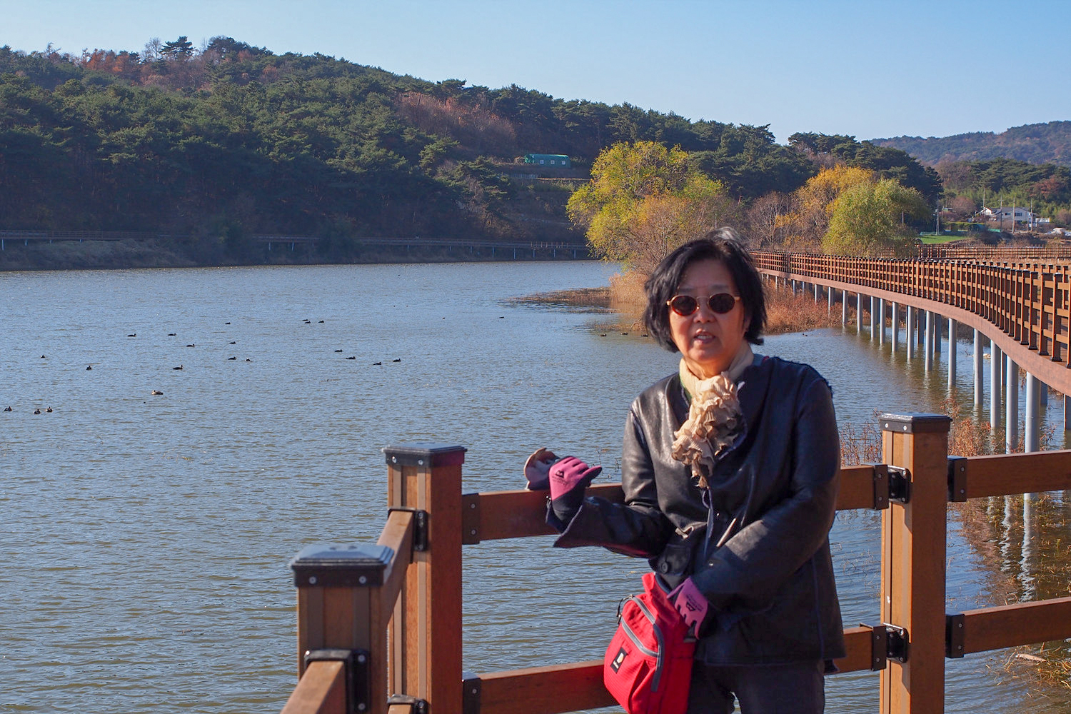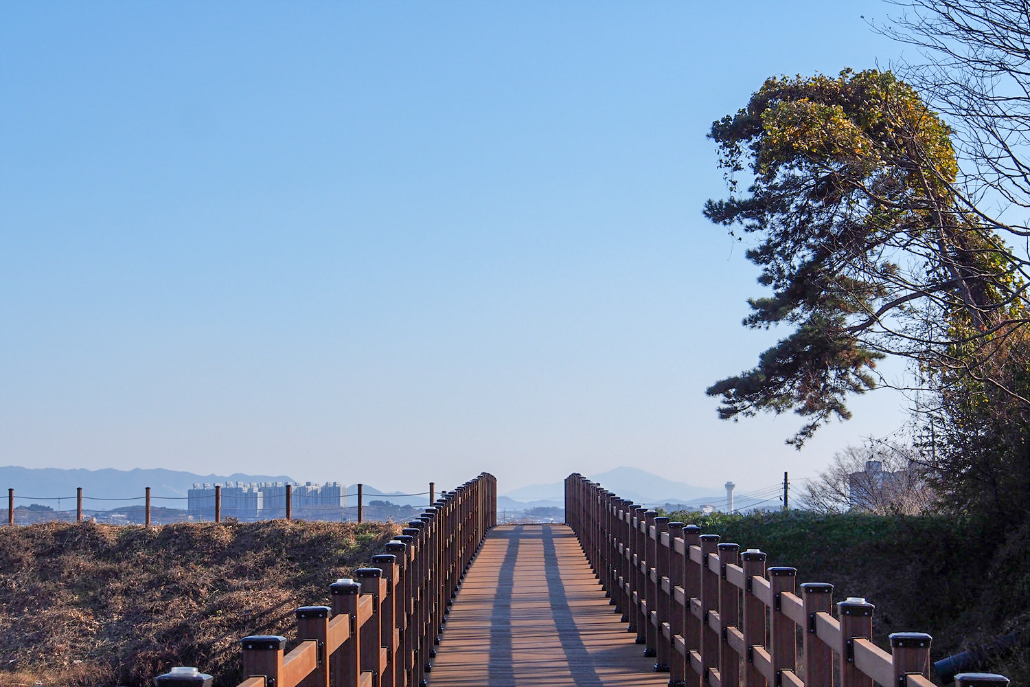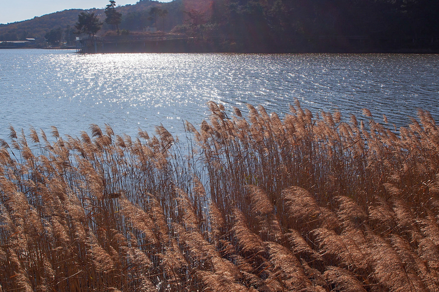 저수지 반대편에 보이는 데크길