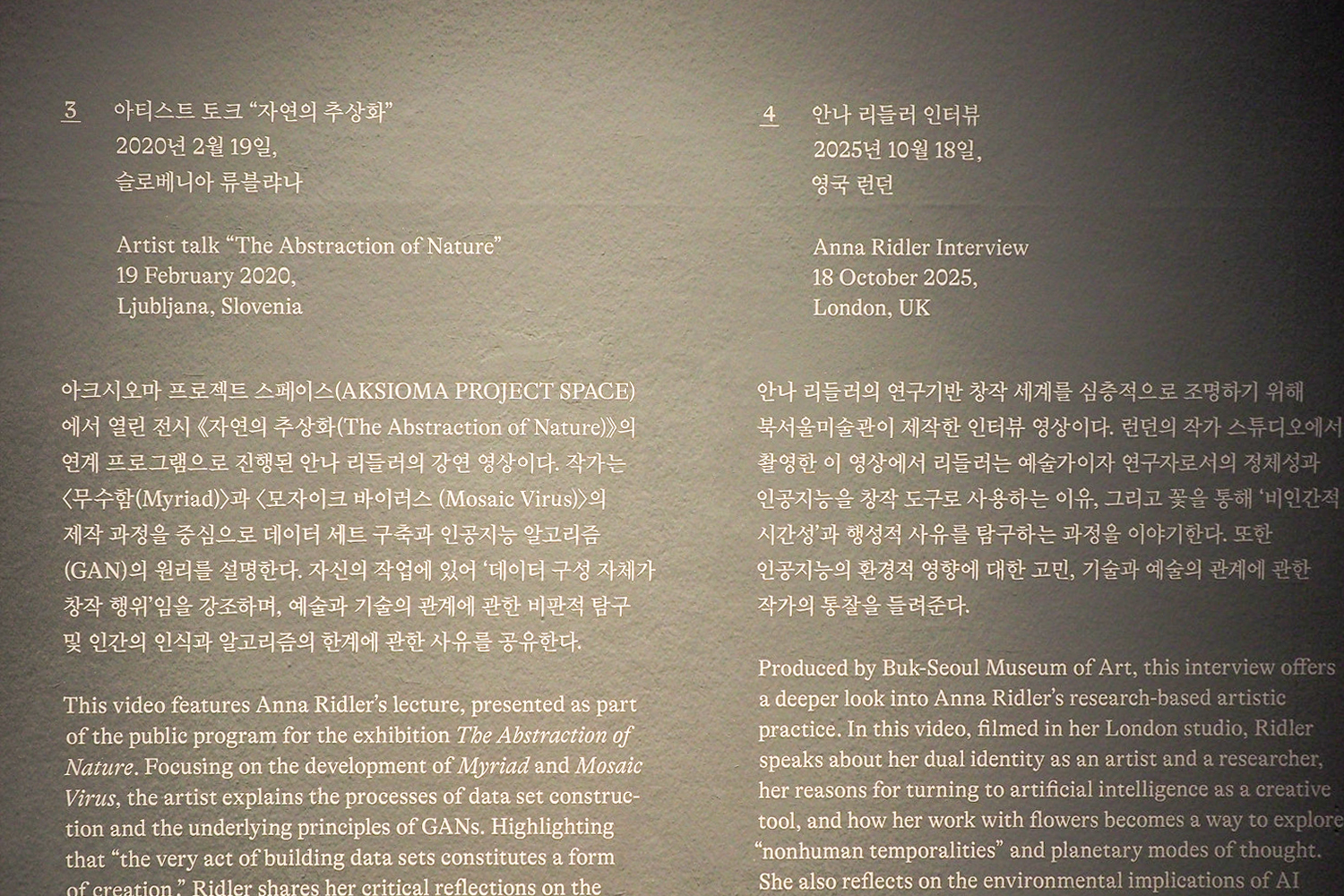 서울시립 북서울미술관의 ‘예술가의 연구’ 시리즈 《미완의 식물지―이소요》, 《꽃 시계―안나 리들러》는 미술사·자연사·생물학·지리학·인공지능 등 다양한 학술 및 기술 영역을 넘나드는 독창적 방식으로 정교하게 축조된 예술가들의 연구에 기반한 창작 세계를 소개하는 전시이다. 작가들은 연구를 단순한 창작의 보조적 요소로 다루지 않고, 긴밀히 맞물린 하나의 축으로서 연구와 창작이 함께 작동하는 방식을 보여준다. 연구-창작의 축은, 타 분야와 예술을 연결 짓는 작업이 가져오는 또 다른 축인 예술-학술, 예술-기술의 축과 교차한다.