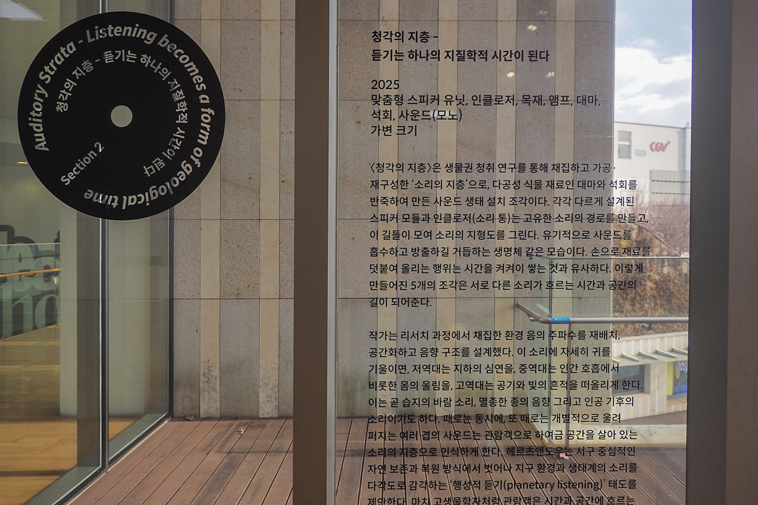 이번 전시는 단순한 청취 경험을 넘어, 세계를 지각하는 방식을 재구성하는 실천이 되길 희망한다. 작가에게 예술은 고정된 답을 제시하는 것이 아니라, 관객의 감각을 열고 세계를 새롭게 바라볼 수 있는 태도를 공유하는 매개체이다. 이를 위해 전시 기간 중 세미나, 워크숍, 퍼포먼스 등을 통해 관객과 함께 우리 스스로 발화하는 (목)소리에도 집중한다. 이렇게 《지구울림》에서 사운드는 경계 너머를 탐색하는 언어가 되어, 인간과 비인간이 함께 만드는 다층적 울림 속에서 우리의 위치를 다시 사유하게 한다. 생물학자 데이비드 조지 해스컬은 “우리는 살아있는 지구의 소리에 귀 기울이는 법을 잊어버렸다는 사실을 가장 두려워해야 한다.”라고 말하며 주변 소리에 귀 기울이는 것이 그 어느 때보다 중요해졌음을 상기시킨다. 다양한 소리의 상실을 느끼는 지금, 우리는 다시 지구와 함께 공생을 위한 울림을 만들 수 있도록 오늘도 우리의 자리에서 귀 기울여야 할 것이다. - 안내문