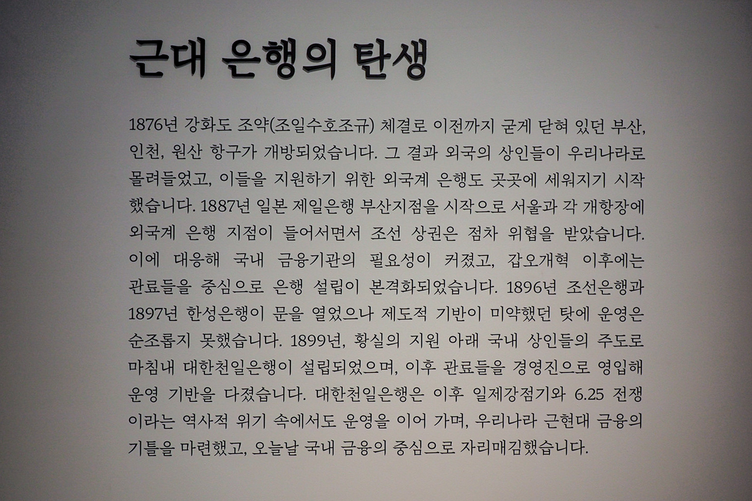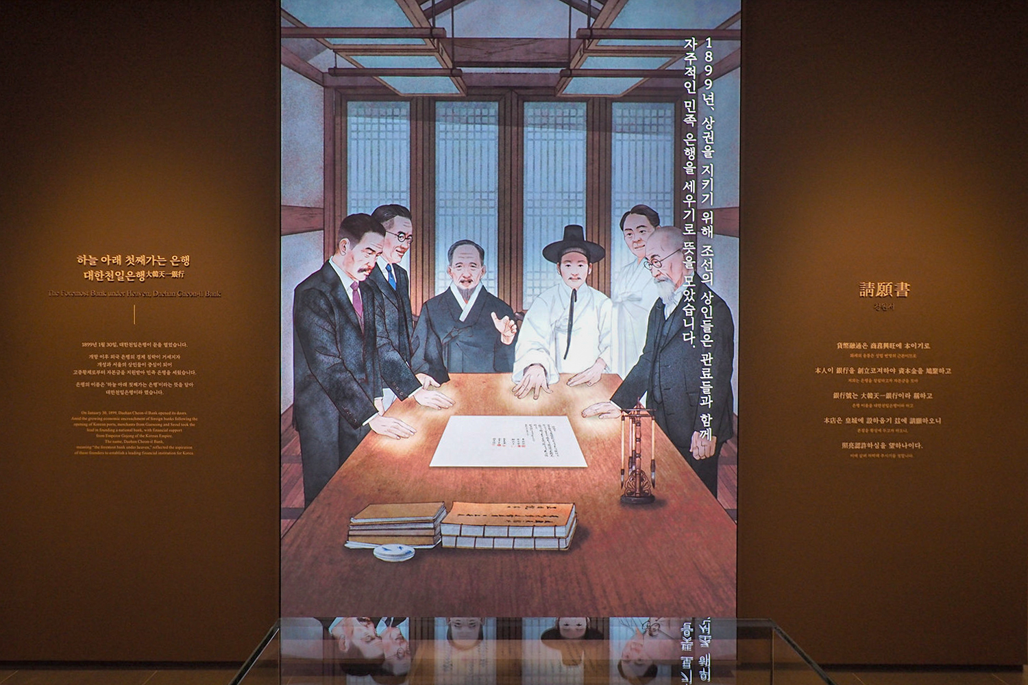 우리은행이 서울 중구 본점 지하 1층에 126년 금융 역사를 담은 전시 공간 '우리1899'를 열었다. 지난 2004년 국내 최초로 개관한 은행사 전문 박물관을 21년만에 리뉴얼했다. '우리1899'는 우리은행의 '우리'에 대한천일은행 창립 연도인 '1899년'을 더한 이름이다. 관람객은 서울시 지정문화재인 '대한천일은행 창립청원서'와 현존 최고(最古) 은행 건물인 '광통관(현 우리은행 종로금융센터)' 재현 조형물 등을 만날 수 있다. - 안내문