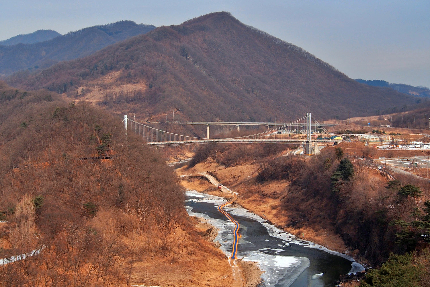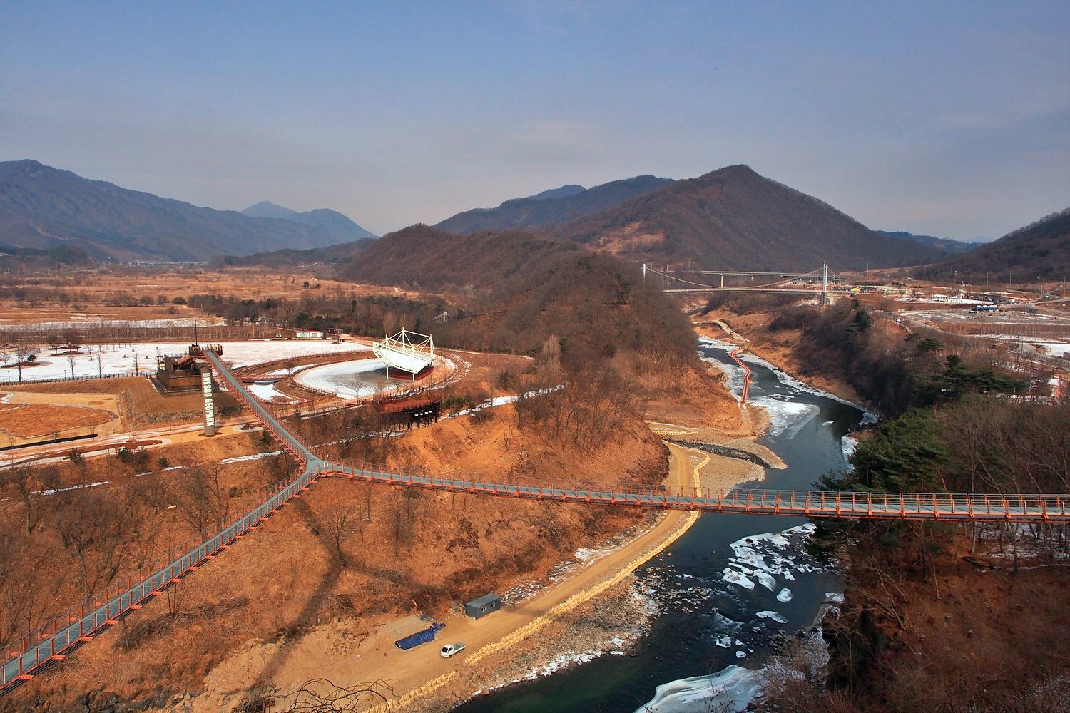 하늘다리에서 바라본 가람길. 멀리 가람누리 전망대와 Y자형 출렁다리가 보인다.