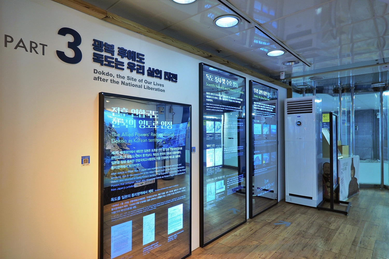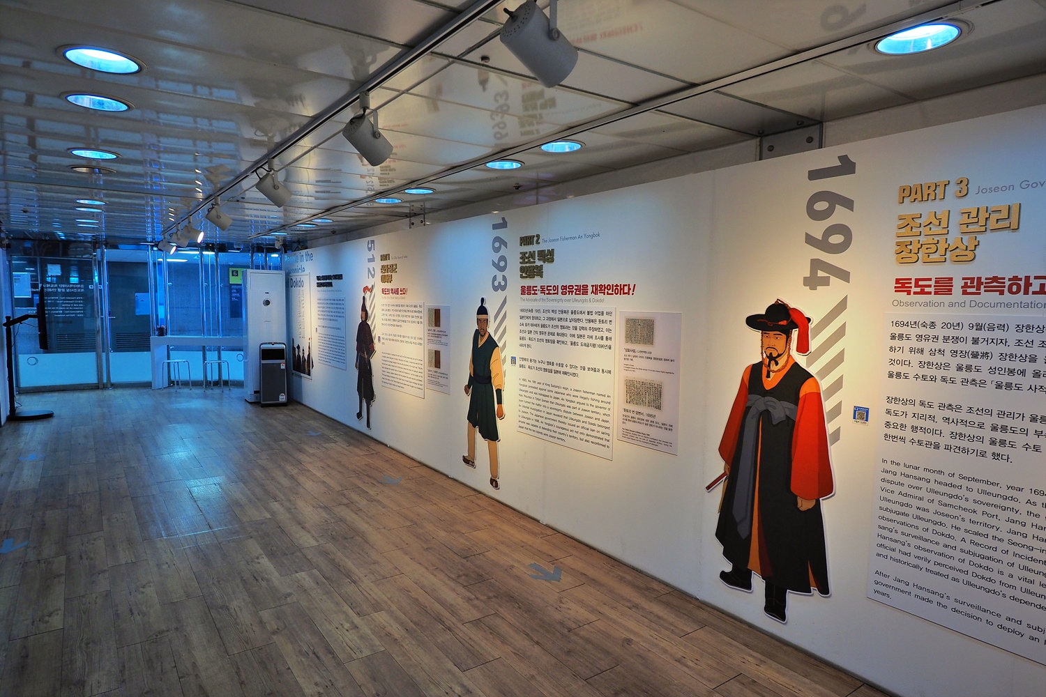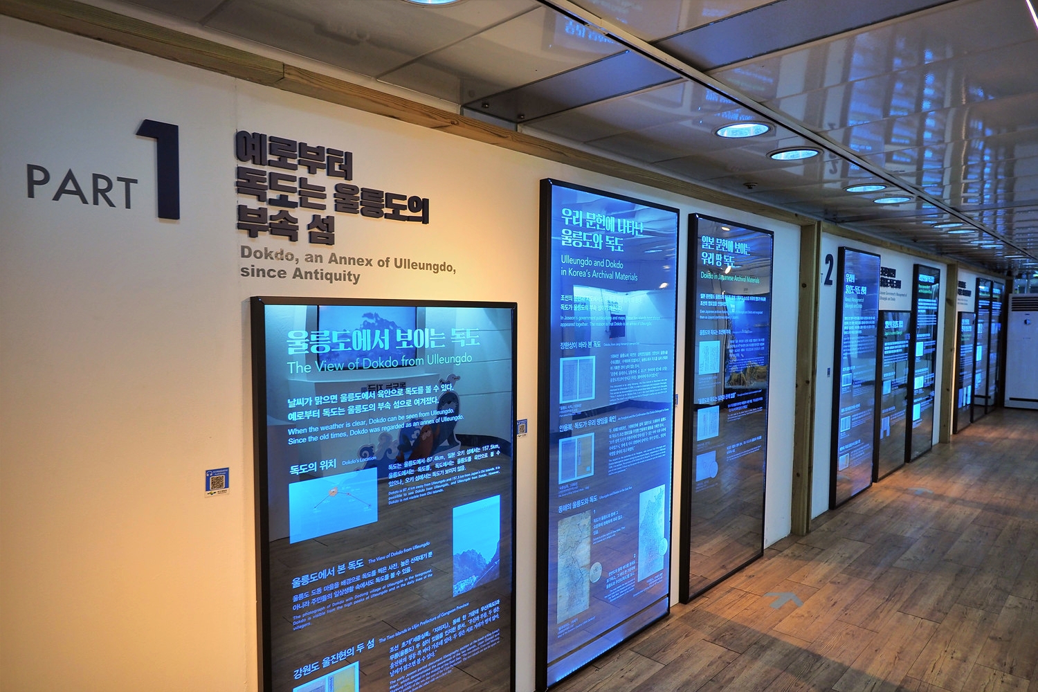 왼쪽, 오른쪽으로 구분하여 살펴볼 수 있는데 입구에서 왼쪽으로 가면 독도에 대한 다양한 이야기를 살펴볼 수 있다. 3개의 파트로 구분하였으며, Part 1. 울릉도의 부속 섬인 독도, Part 2. 조선 정부의 울릉도 독도 관리, Part 3. 광복 후에도 독도는 우리 삶의 터전이라는 주제로 이루어져 있다.