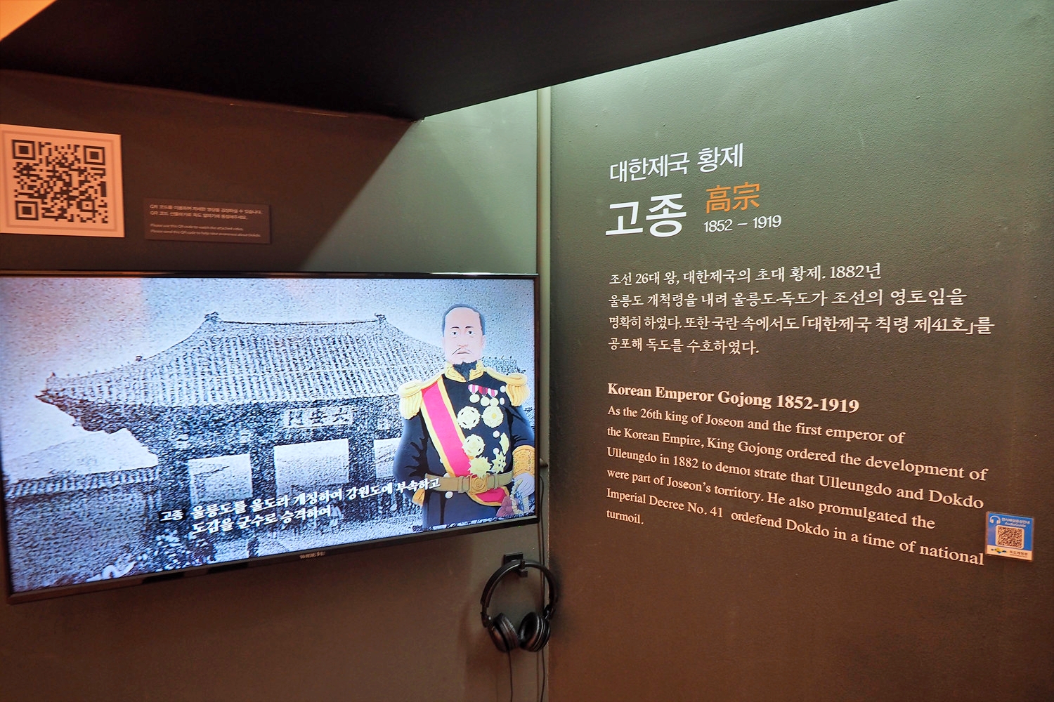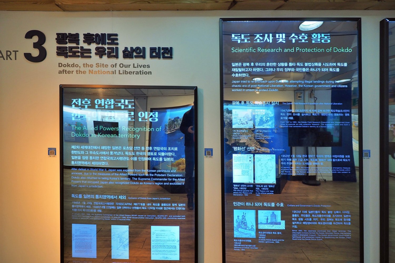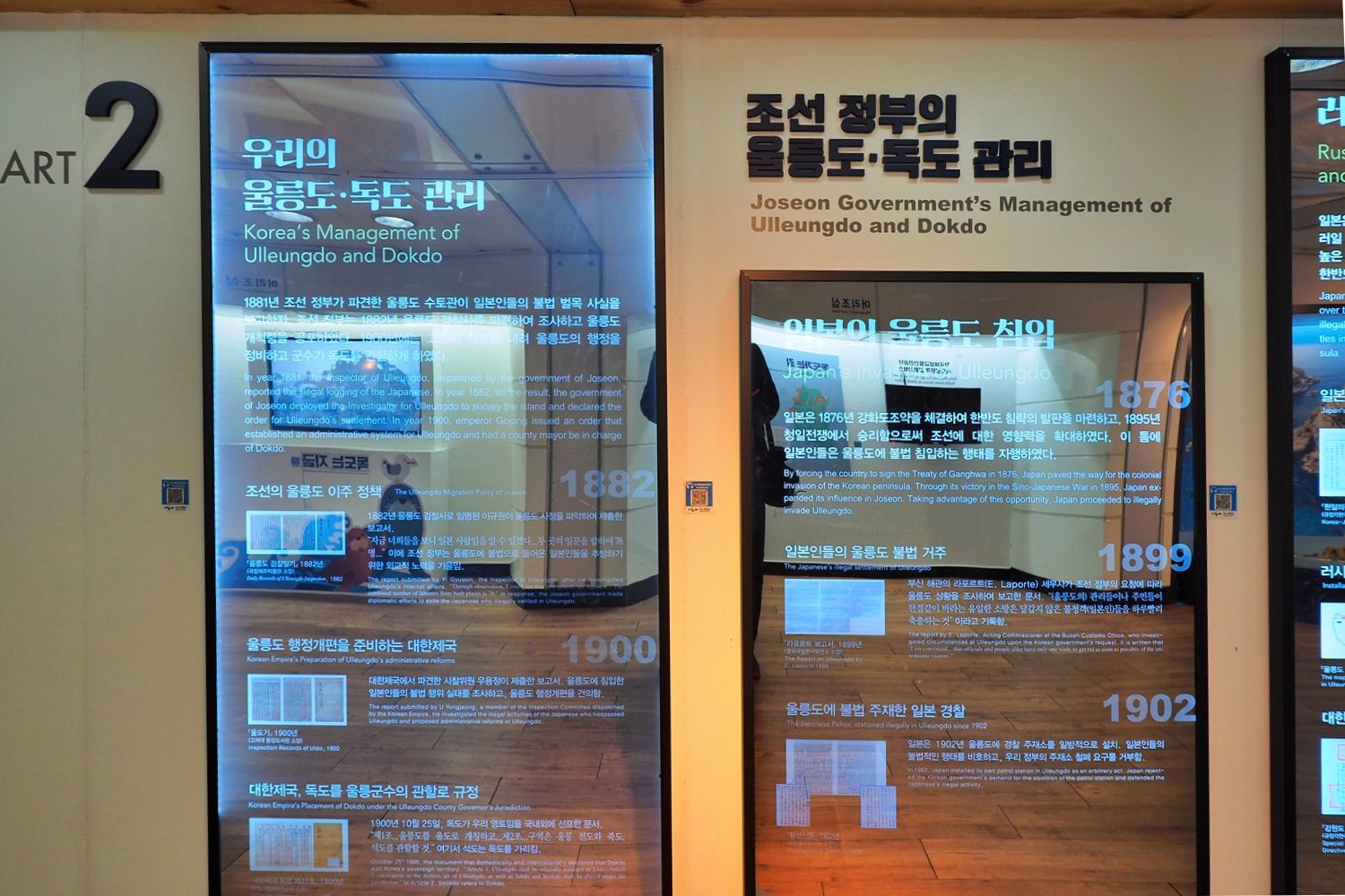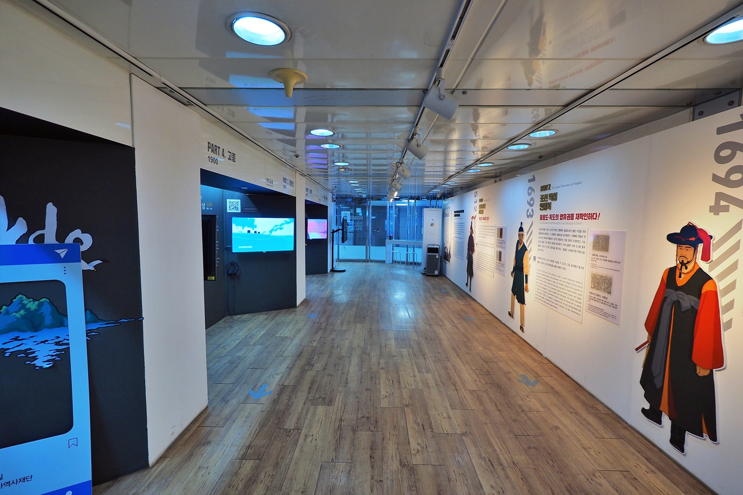 왼쪽, 오른쪽으로 구분하여 살펴볼 수 있는데 입구에서 왼쪽으로 가면 독도에 대한 다양한 이야기를 살펴볼 수 있다. 3개의 파트로 구분하였으며, Part 1. 울릉도의 부속 섬인 독도, Part 2. 조선 정부의 울릉도 독도 관리, Part 3. 광복 후에도 독도는 우리 삶의 터전이라는 주제로 이루어져 있다.