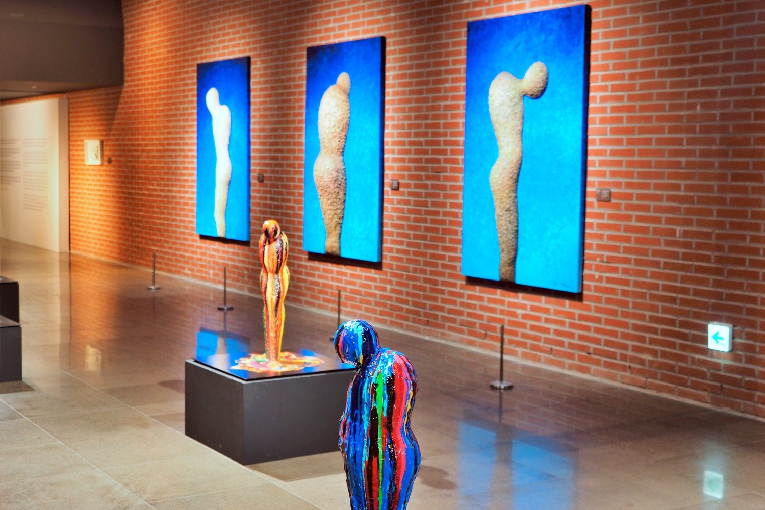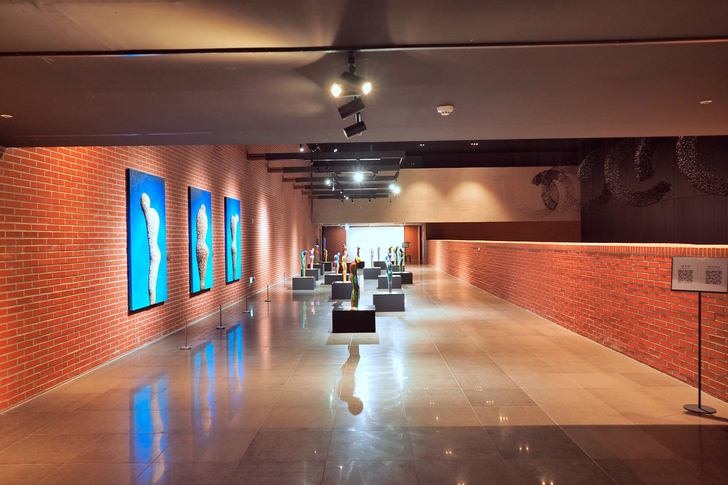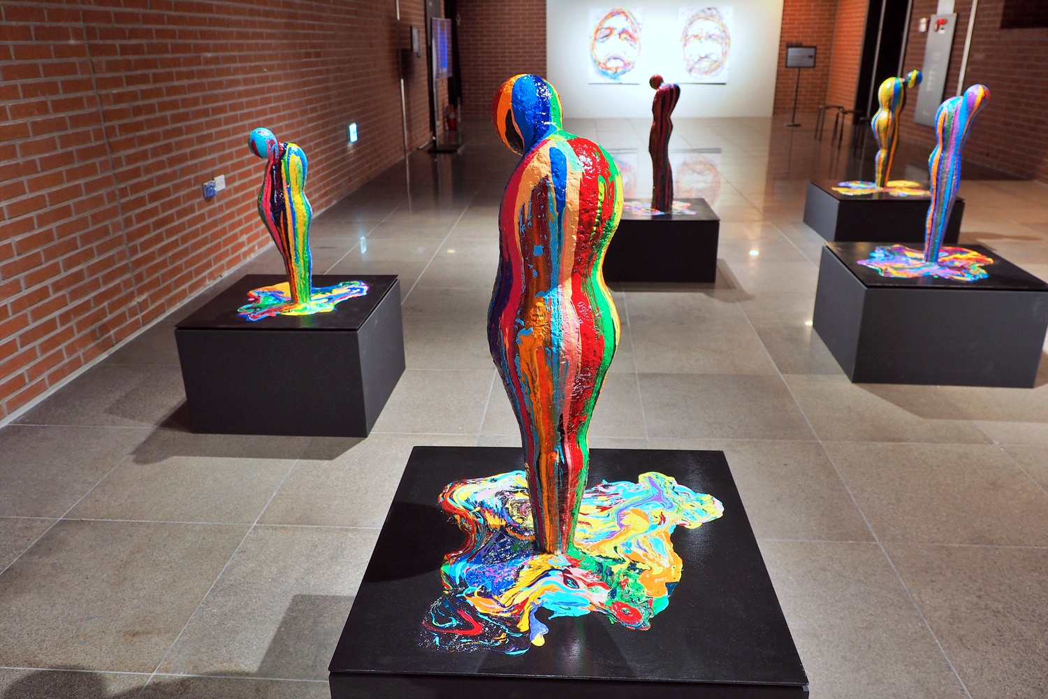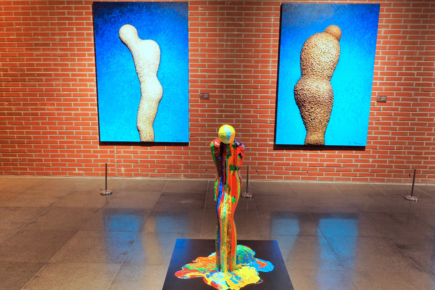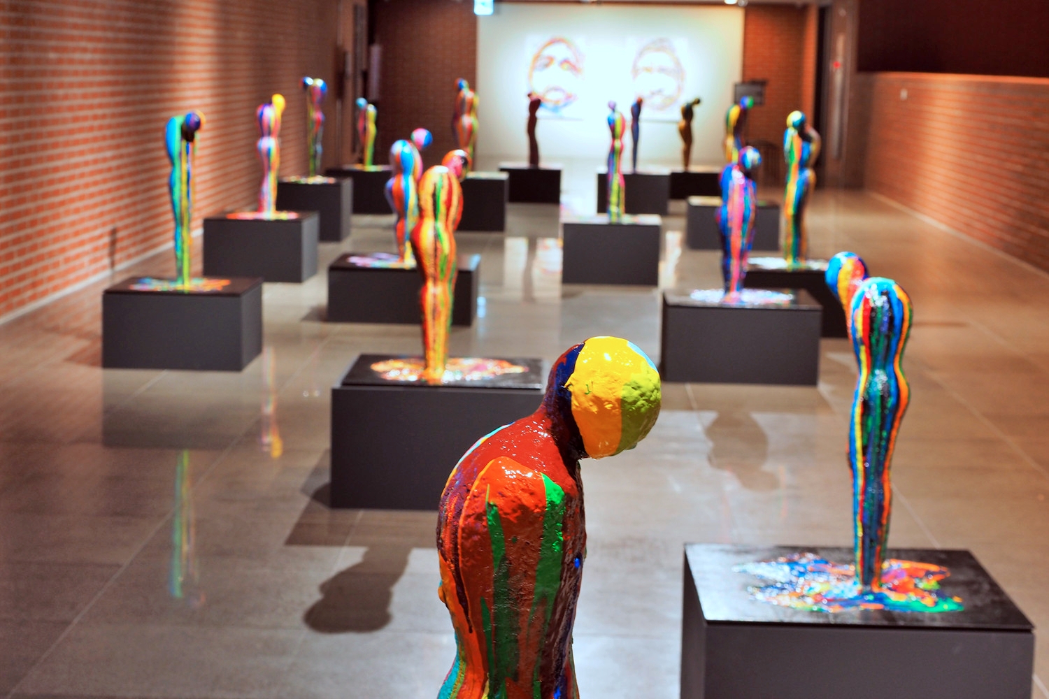 다양한 조각, 부조, 회화, 드로잉 연작들과 더불어 이번 전시의 중심을 이루는 섀도우 피플(Shadow People) 시리즈는 현대인의 자화상을 상징적으로 구현한 작품이다. 마치 스마트폰에 몰두한 현대인의 실루엣처럼 보이지만, 또한 자신의 심연을 응시하는 인간의 형상이기도 하다. 작가는 ‘그림자‘를 비추어 인간의 사회적 자아와 내면의 자아, 문명과 자연, 본질과 현상이 교차하는 지점을 탐색한다. ‘섀도우 피플’ 조각상의 몸을 타고 흘러내리는 안료는 단순한 조형 요소를 넘어, 정신의 정화와, 감정의 씻김, 그리고 내면의 회복을 시각화한다. 작가는 인간의 모순과 결함을 숨기지 않고, 그 안에서 공감의 가능성을 찾기 위한 노력, 즉 인간다움을 회복해 나가는 과정으로서의 예술을 이야기한다. - 안내문
