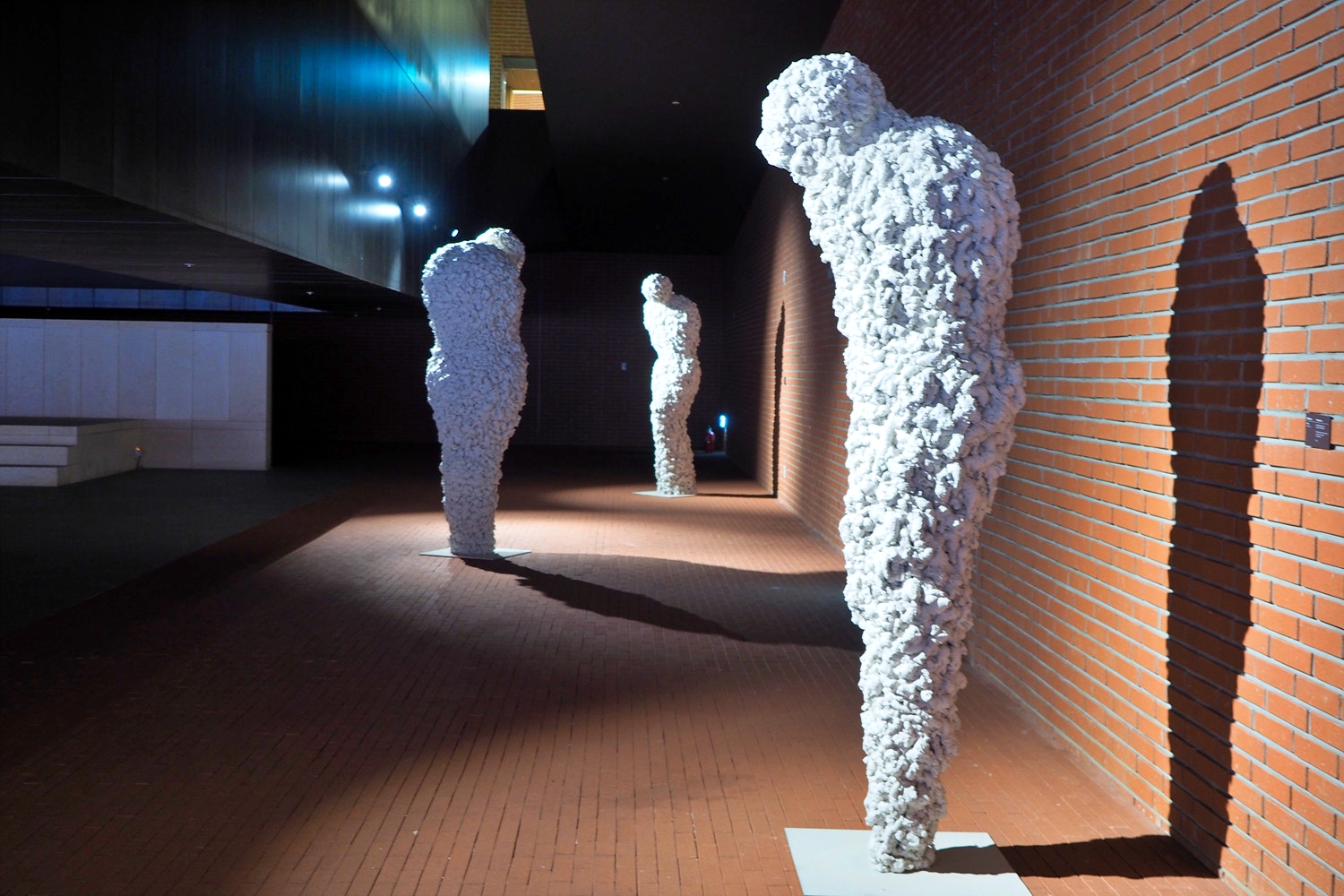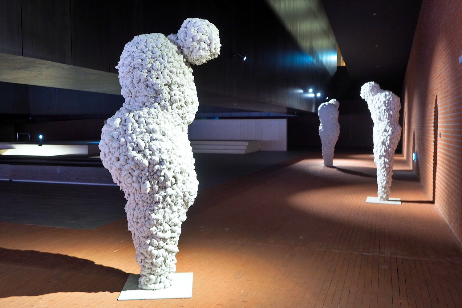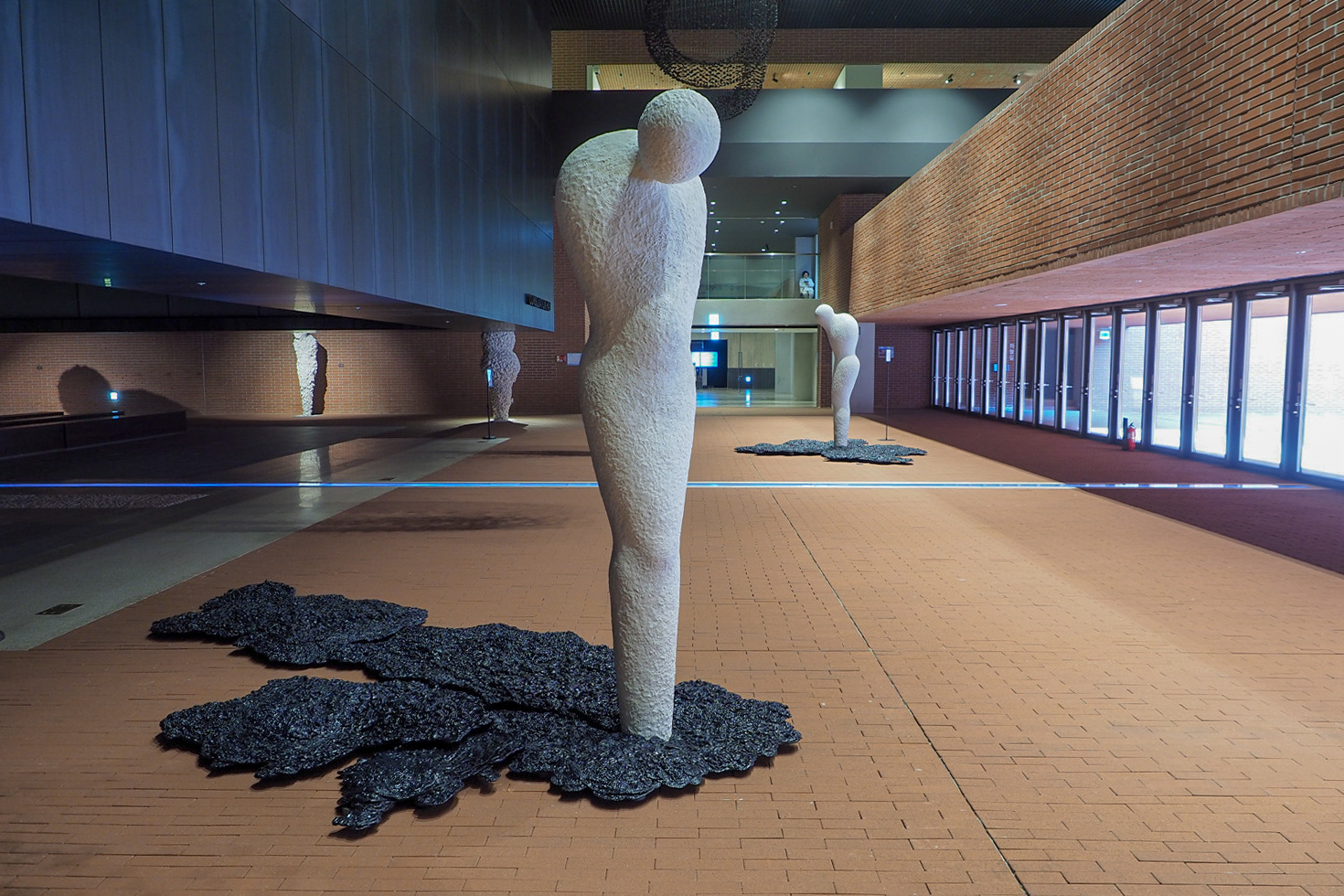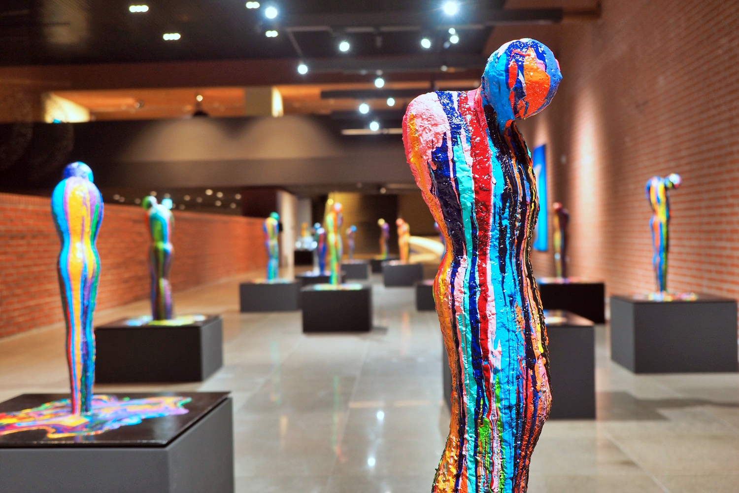 다양한 조각, 부조, 회화, 드로잉 연작들과 더불어 이번 전시의 중심을 이루는 섀도우 피플(Shadow People) 시리즈는 현대인의 자화상을 상징적으로 구현한 작품이다. 마치 스마트폰에 몰두한 현대인의 실루엣처럼 보이지만, 또한 자신의 심연을 응시하는 인간의 형상이기도 하다. 작가는 ‘그림자‘를 비추어 인간의 사회적 자아와 내면의 자아, 문명과 자연, 본질과 현상이 교차하는 지점을 탐색한다. ‘섀도우 피플’ 조각상의 몸을 타고 흘러내리는 안료는 단순한 조형 요소를 넘어, 정신의 정화와, 감정의 씻김, 그리고 내면의 회복을 시각화한다. 작가는 인간의 모순과 결함을 숨기지 않고, 그 안에서 공감의 가능성을 찾기 위한 노력, 즉 인간다움을 회복해 나가는 과정으로서의 예술을 이야기한다. - 안내문