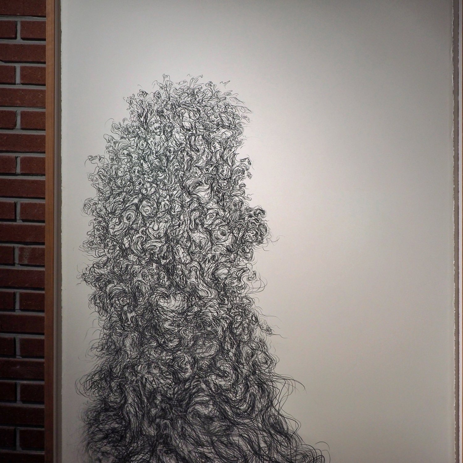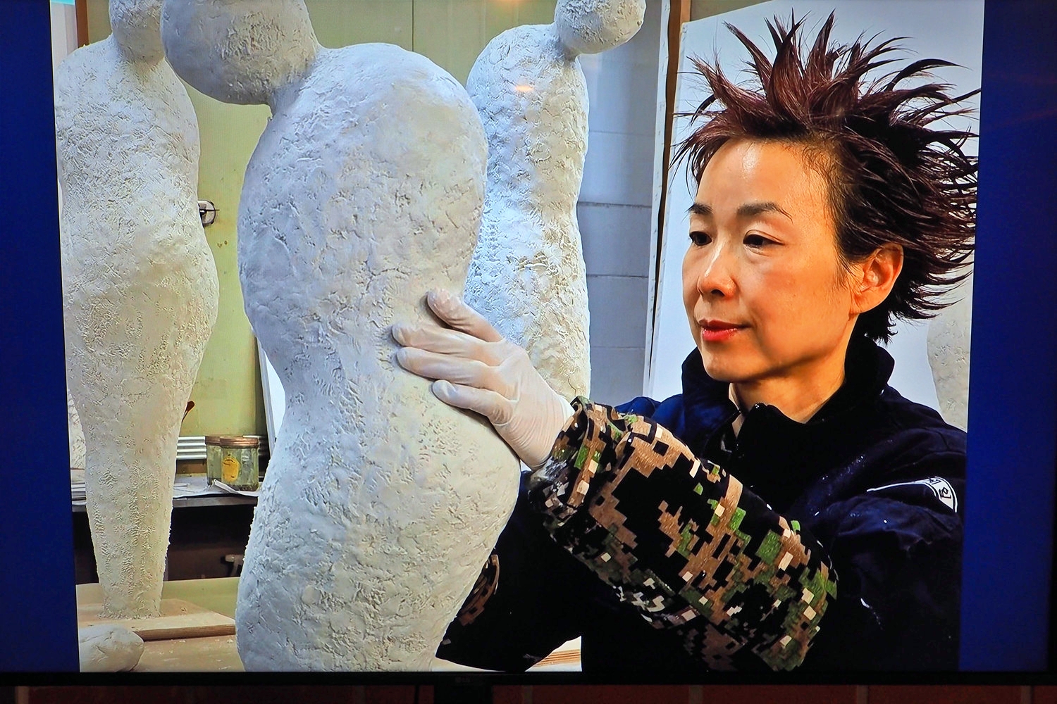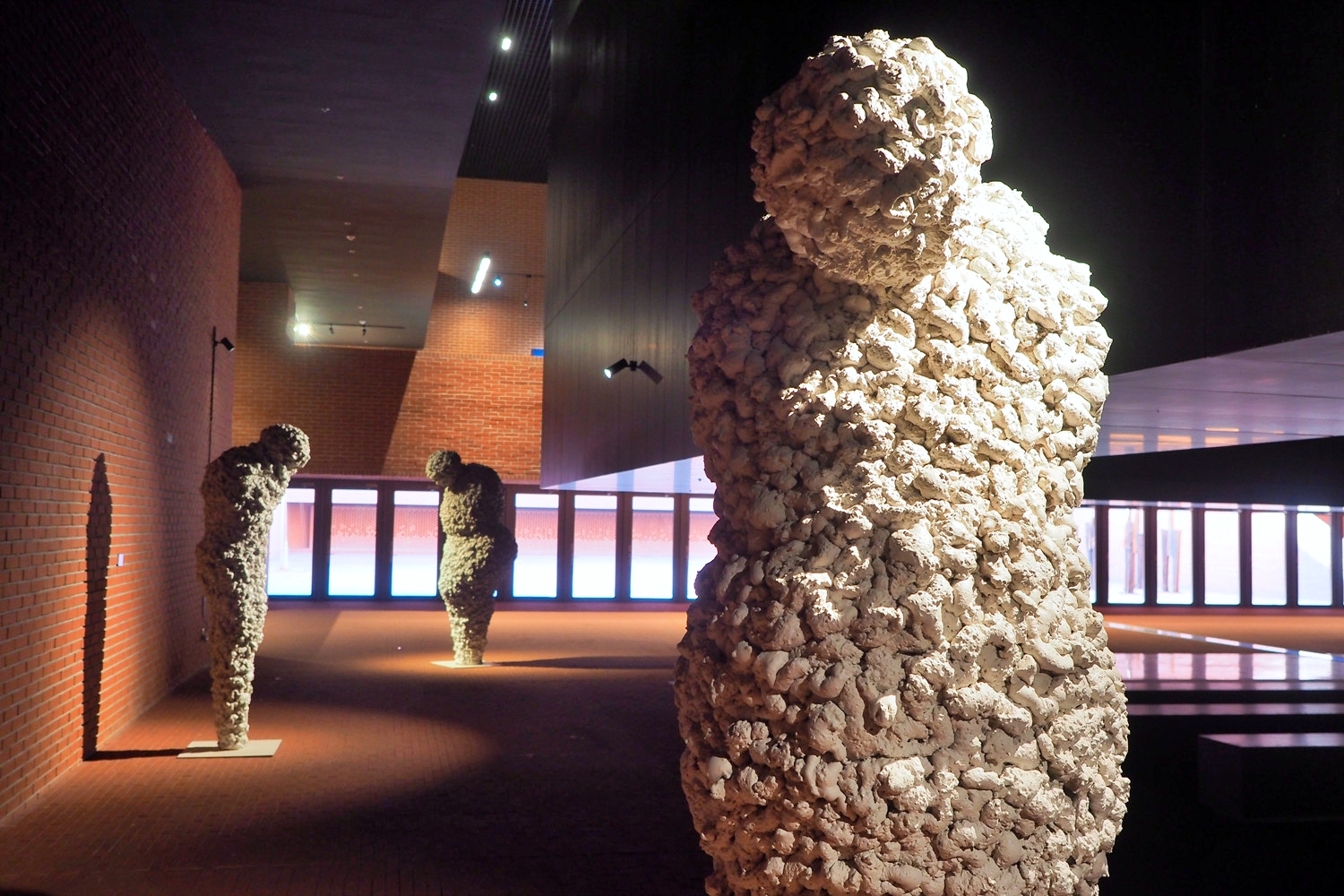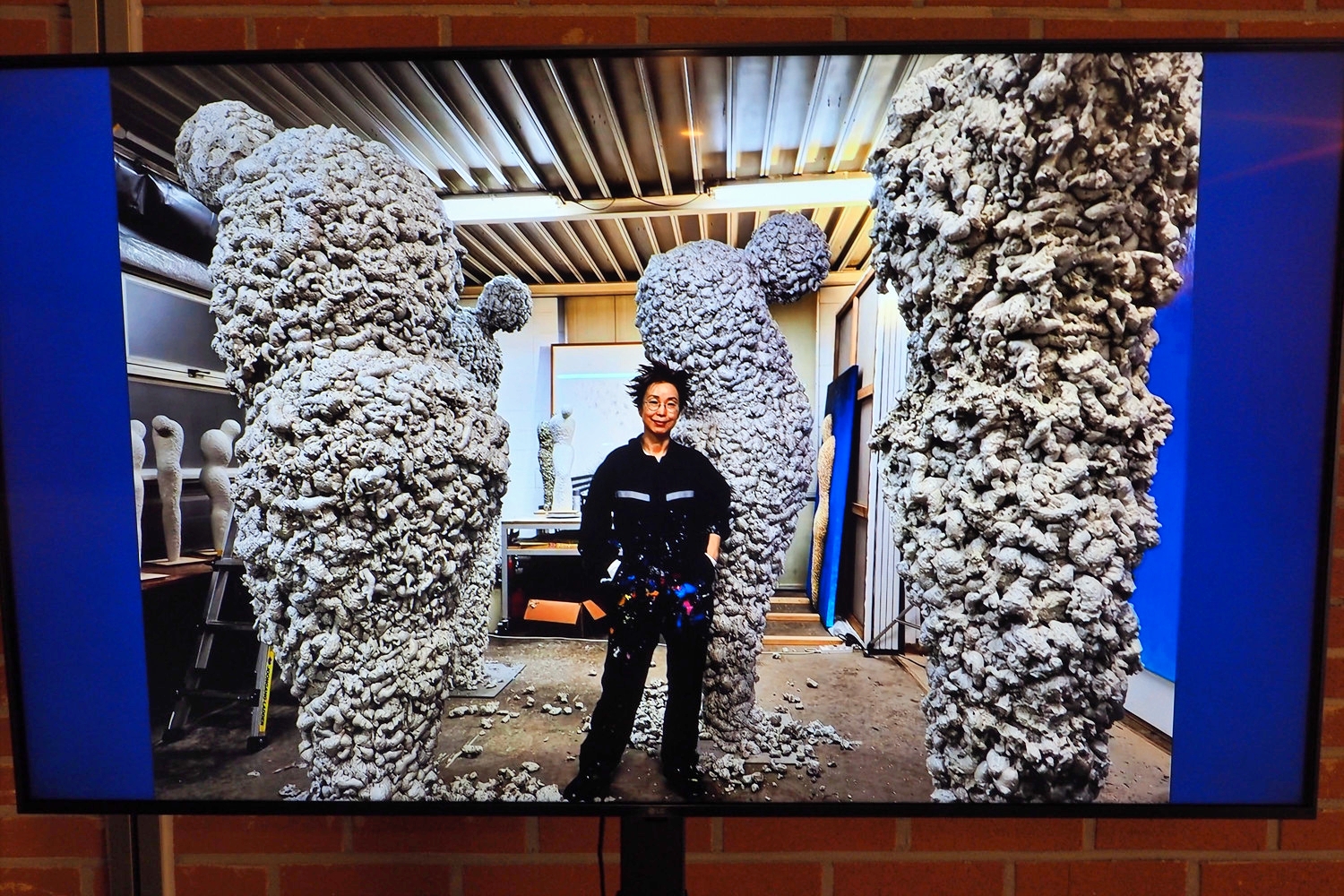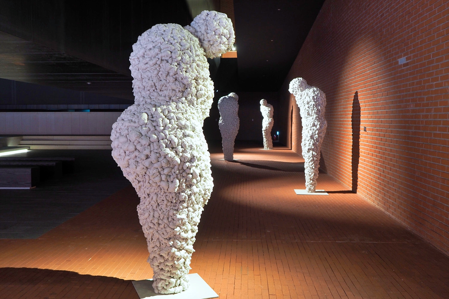 다양한 조각, 부조, 회화, 드로잉 연작들과 더불어 이번 전시의 중심을 이루는 섀도우 피플(Shadow People) 시리즈는 현대인의 자화상을 상징적으로 구현한 작품이다. 마치 스마트폰에 몰두한 현대인의 실루엣처럼 보이지만, 또한 자신의 심연을 응시하는 인간의 형상이기도 하다. 작가는 ‘그림자‘를 비추어 인간의 사회적 자아와 내면의 자아, 문명과 자연, 본질과 현상이 교차하는 지점을 탐색한다. ‘섀도우 피플’ 조각상의 몸을 타고 흘러내리는 안료는 단순한 조형 요소를 넘어, 정신의 정화와, 감정의 씻김, 그리고 내면의 회복을 시각화한다. 작가는 인간의 모순과 결함을 숨기지 않고, 그 안에서 공감의 가능성을 찾기 위한 노력, 즉 인간다움을 회복해 나가는 과정으로서의 예술을 이야기한다. - 안내문