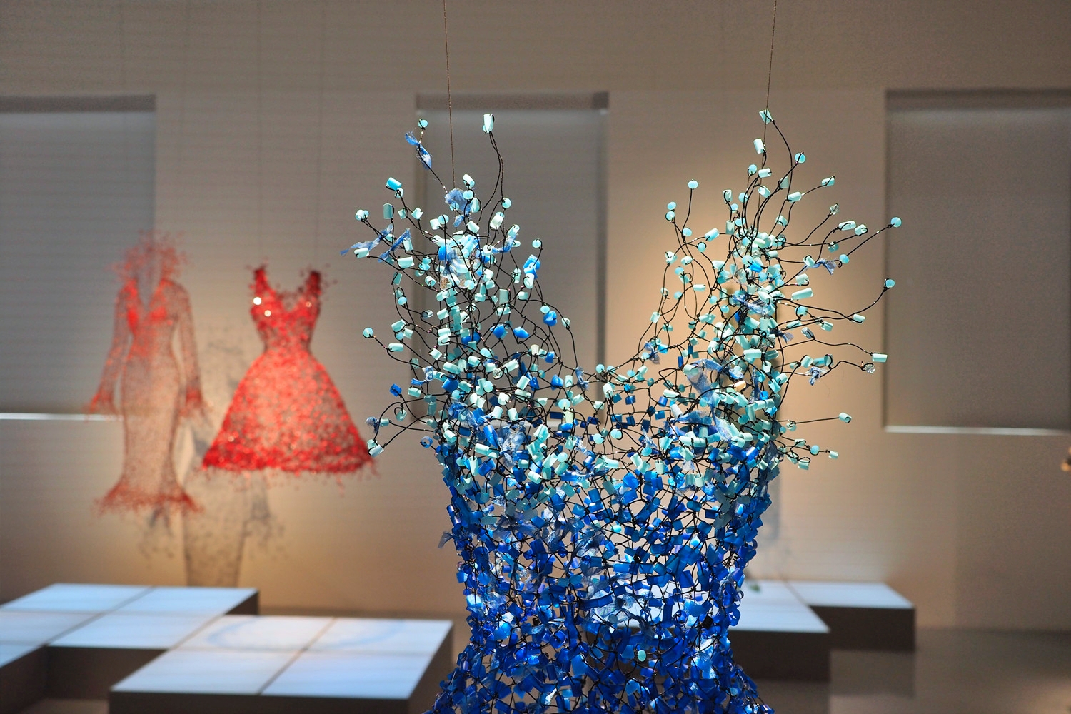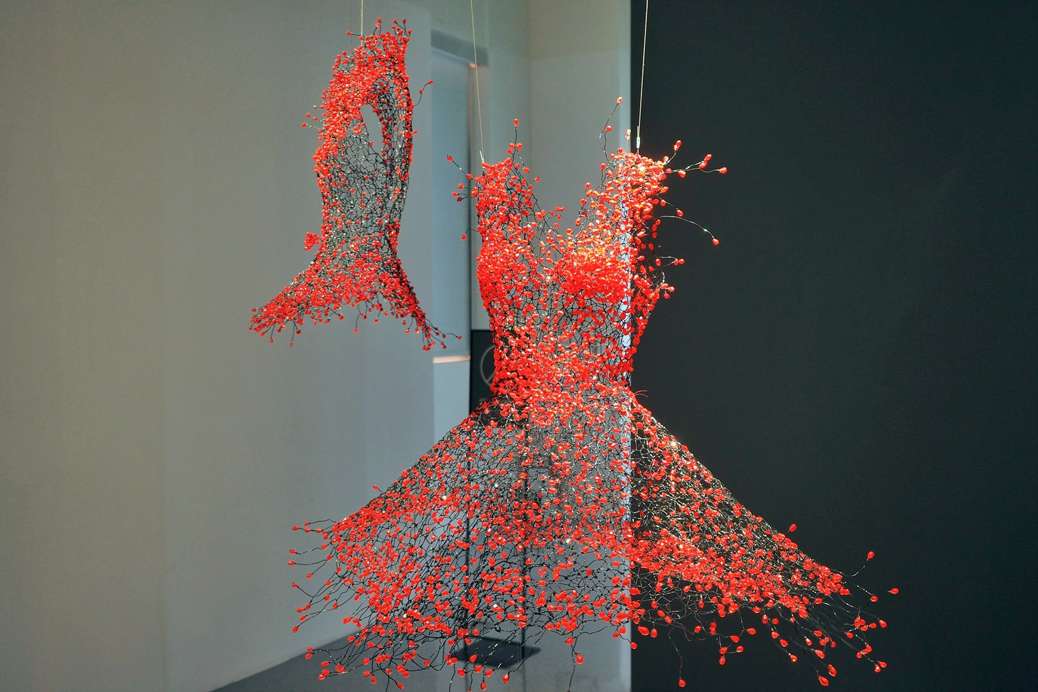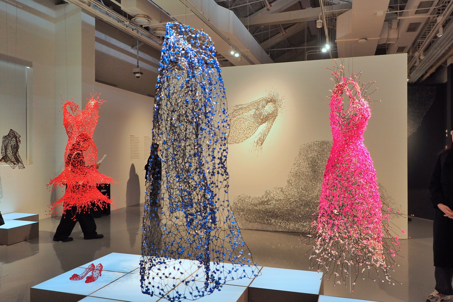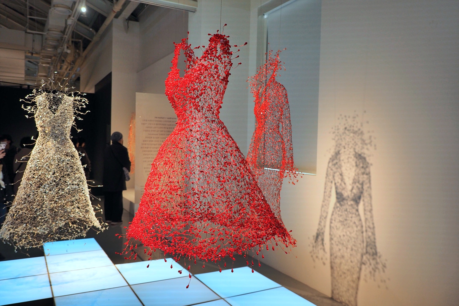 Dreaming, Dancing, Enlightening 세 개의 키워드를 따라 전시장을 걷다 보면, 입는 예술이 몸을 넘어 공간과 환경, 관계의 의미로 확장되는 과정을 자연스럽게 경험하게 된다. 철사로 만든 빈 드레스가 벽과 공간으로 이어지며 조형 언어가 되는 장면은 특히 인상 깊었다.
