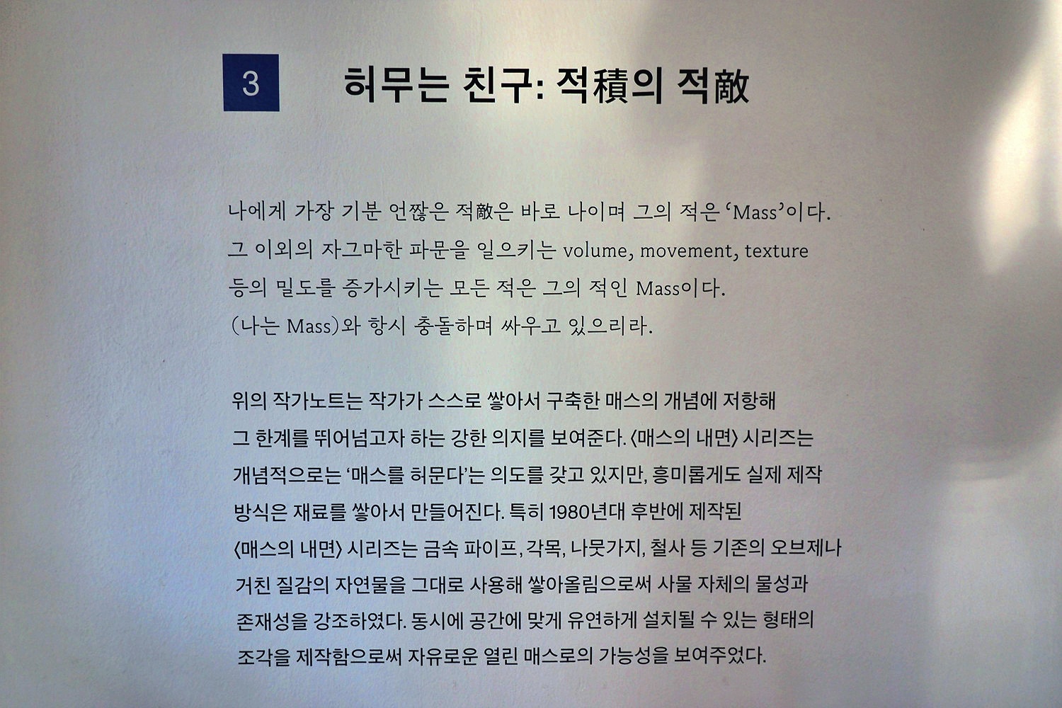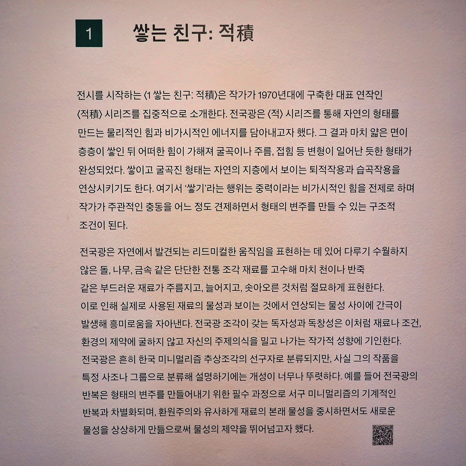 전시는 ‘쌓다’에 해당하는 〈적〉 시리즈와 ‘허물다’에 해당하는 〈매스의 내면〉 시리즈를 알리는데 집중해 다음의 네 개의 섹션으로 구성된다. 첫 번째 섹션 〈쌓는 친구: 적(積)〉에서는 1970년대 구축한 작업세계의 결과로 전국광의 대표작이라 할 수 있는 형태를 쌓아 올리면서 주름 등 형태의 변주를 꾀한 〈적(積)〉 시리즈를 소개한다. 두 번째 섹션 〈매스를 기리며: 매스의 비(碑)〉는 1981년 제30회 국전 비구상부문 대상을 수상한 작품 〈매스의 비(碑)〉를 통해 전국광 작업세계의 변곡점을 짚어낸다. 세 번째 섹션 〈허무는 친구: 적(積)의 적(敵)〉은 매스의 제약에서 벗어나고자 실험한 결과 이르게 된 〈매스의 내면〉 시리즈를 두 개의 공간에서 나누어 소개한다. 네 번째 섹션 〈예술가의 목소리〉는 작가에게 조형작업의 중요한 토대이자 또 다른 예술적 창작 활동이었던 문학적 글쓰기를 소개하며 전방위 예술가 전국광의 입체적인 면모를 보여준다.