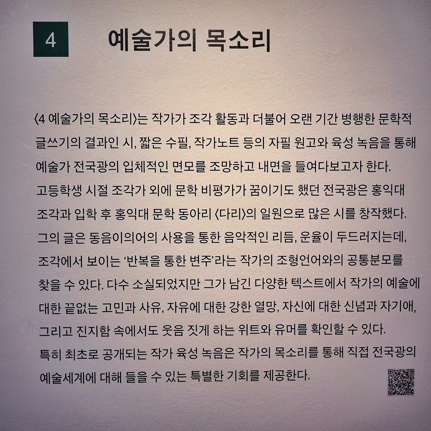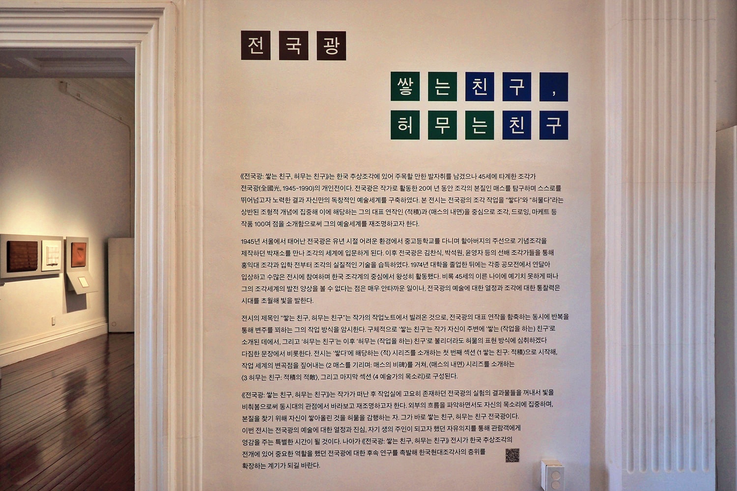 《전국광: 쌓는 친구, 허무는 친구》는 한국 추상조각에 있어 주목할 만한 발자취를 남겼으나 불의의 사고로 45세에 타계한 조각가 전국광(全國光, 1945~1990)의 개인전이다. 전국광은 작가로 활동한 20여 년 동안 조각의 본질인 매스를 끊임없이 탐구하며 스스로를 뛰어넘고자 부단히 노력하였으며, 자신만의 독창적인 예술세계를 구축하였다. 본 전시는 전국광의 조각 작업을 “쌓다’와 “허물다”라는 상반된 조형적 개념에 집중해 이에 해당하는 그의 대표 연작인 〈적(積)〉과 〈매스의 내면〉을 중심으로 석조각, 목조각, 금속조각, 드로잉, 마케트 등 작품 100여 점을 소개한다.
