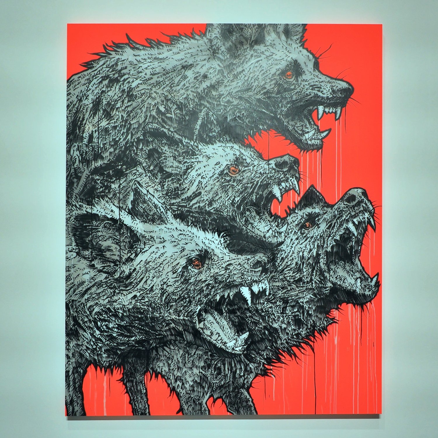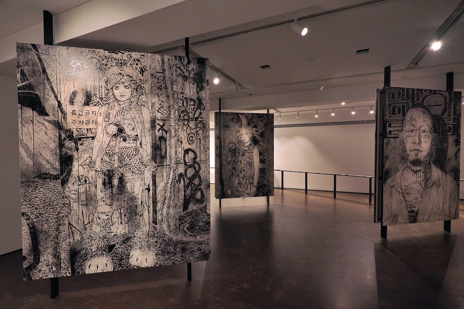 전시장 입구에 설치된 〈개들이 짖는다〉는 들개가 으르렁거리는 소리(Grrr)를 시각화한 작품으로, 전시의 제목임과 동시에 지알원의 작가적 태도를 상징한다. 그의 들개는 무작정 공격적인 게 아니라, 지키고 드러내기 위해 울부짖는다. 주류와 비주류를 가르는 제도의 폭력성에 맞서, 사회 주변부에서 사라지고 잊히는 대상을 지속적으로 호출한다. ‘여기에 있었다’는 존재적 사실을 발언하는 것이다.