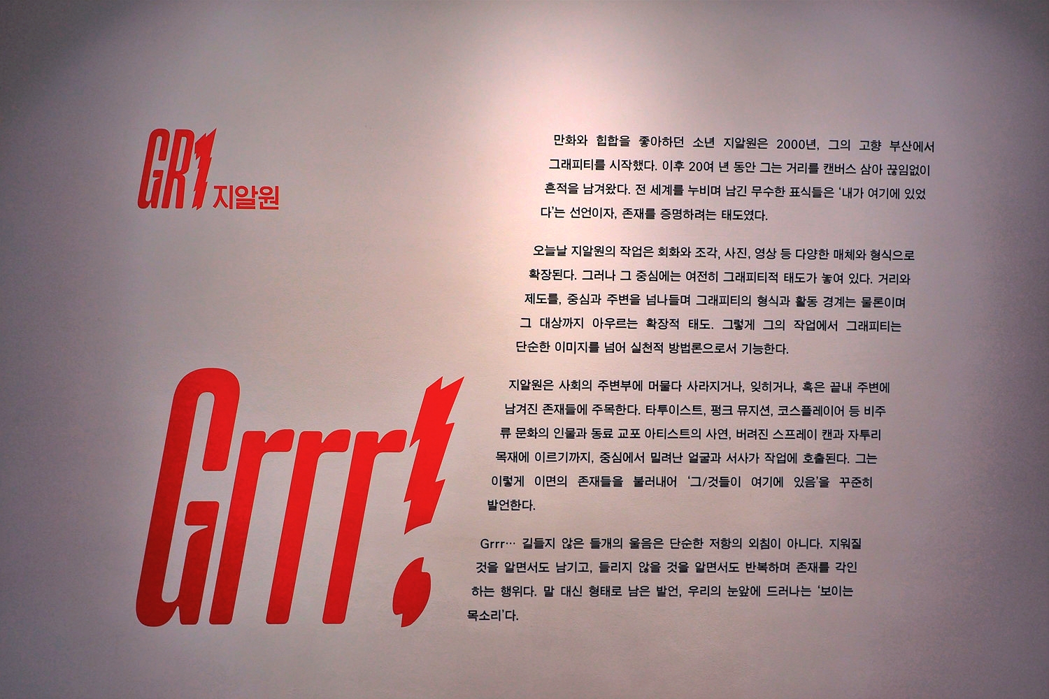 OCI미술관(관장: 이지현)은 오는 1월 28일부터 3월 28일까지 그래피티 아티스트 지알원(GR1)의 초대 개인전 《Grrr!》展을 개최한다.